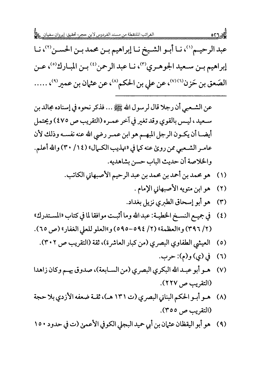 عبد الرحيم (¬١)، نا أبو الشيخ نا إبراهيم بن محمد بن الحسن (¬٢)، نا إبراهيم بن سعيد الجوهري (¬٣)، نا عبد الرحمن (¬٤) بن المبارك (¬٥)، عن الصَعق بن حَزن (¬٦) (¬٧)، عن علي بن الحكم (¬٨)، عن عثمان بن عمير (¬٩)، . . . .