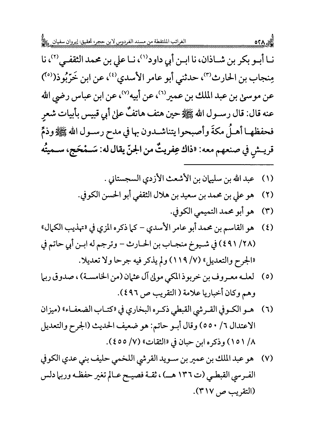 (¬٦) هو الكوفي القرشي القبطي ذكره البخاري في "كتاب الضعفاء" (ميزان الاعتدال ٦/ ٥٥٠) وقال أبو حاتم: هو ضعيف الحديث (الجرح والتعديل ٨/ ١٥١) وذكره ابن حبان في "الثقات" (٧/ ٤٥٥).