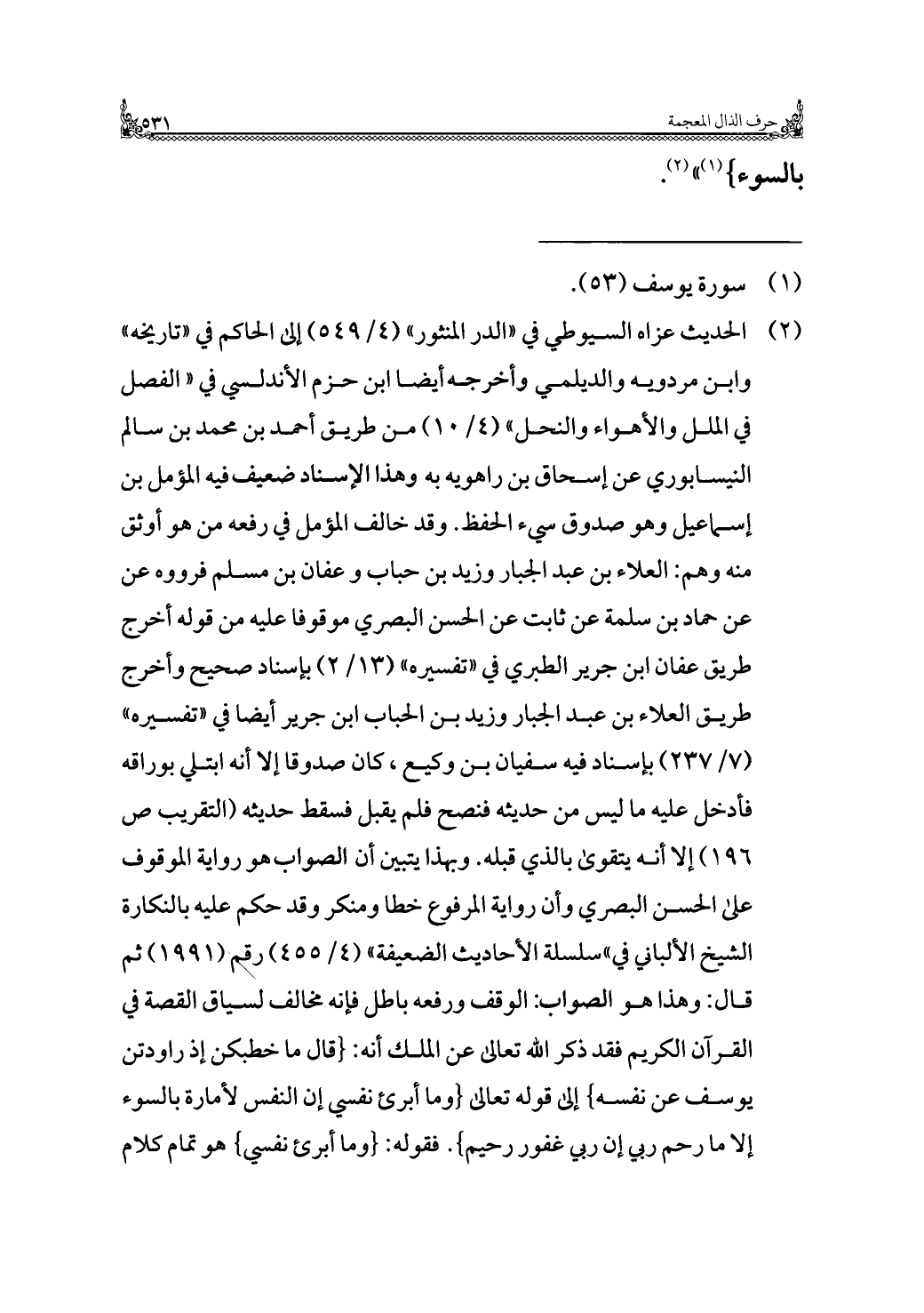 (¬٢) الحديث عزاه السيوطي في "الدر المنثور" (٤/ ٥٤٩) إلى الحاكم في "تاريخه" وابن مردويه والديلمي وأخرجه أيضًا ابن حزم الأندلسي في "الفصل في الملل والأهواء والنحل" (٤/ ١٠) من طريق أحمد بن محمد بن سالم النيسابوري عن إسحاق بن راهويه به وهذا الإسناد ضعيف فيه المؤمل بن إسماعيل وهو صدوق سيء الحفظ. وقد خالف المؤمل في رفعه من هو أوثق منه وهم: العلاء بن عبد الجبار وزيد بن حباب وعفان بن مسلم فرووه عن حماد بن سلمة عن ثابت عن الحسن البصري موقوفًا عليه من قوله أخرج طريق عفان ابن جرير الطبري في "تفسيره" (١٣/ ٢) بإسناد صحيح وأخرج طريق العلاء بن عبد الجبار وزيد بن الحباب ابن جرير أيضًا في "تفسيره" (٧/ ٢٣٧) بإسناد فيه سفيان بن وكيع، كان صدوقا إلا أنه ابتلي بوراقه فأدخل عليه ما ليس من حديثه فنصح فلم يقبل فسقط حديثه (التقريب ص ١٩٦) إلا أنه يتقوى بالذي قبله. وبهذا يتبين أن الصواب هو رواية الموقوف على الحسن البصري وأن رواية المرفوع خطأ ومنكر وقد حكم عليه بالنكارة الشيخ الألباني في "سلسلة الأحاديث الضعيفة" (٤/ ٤٥٥) رقم (١٩٩١) ثم قال: وهذا هو الصواب: الوقف ورفعه باطل فإنه مخالف لسياق القصة في القرآن الكريم فقد ذكر الله تعالى عن الملك أنه: {قَالَ مَا خَطْبُكُنَّ إِذْ رَاوَدْتُنَّ يُوسُفَ عَنْ نَفْسِهِ} إلى قوله تعالى {وَمَا أُبَرِّئُ نَفْسِي إِنَّ النَّفْسَ لَأَمَّارَةٌ بِالسُّوءِ إِلَّا مَا رَحِمَ رَبِّي إِنَّ رَبِّي غَفُورٌ رَحِيمٌ}. فقوله: {وَمَا أُبَرِّئُ نَفْسِي} هو تمام كلام =