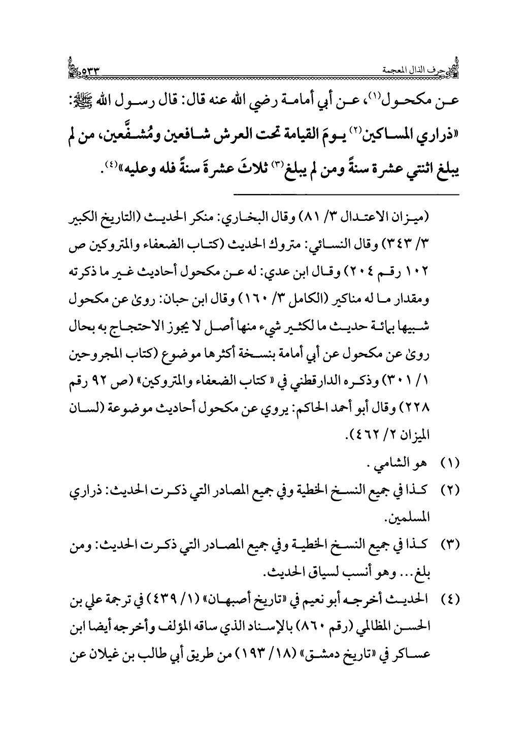 عن مكحول (¬١)، عن أبي أمامة رضي الله عنه قال: قال رسول الله - صلى الله عليه وسلم -: "ذراري المساكين (¬٢) يومَ القيامة تحت العرش شافعين ومُشفَّعين، من لم يبلغ اثنتي عشرة سنةً ومن لم يبلغ (¬٣) ثلاثَ عشرةَ سنةً فله وعليه" (¬٤).