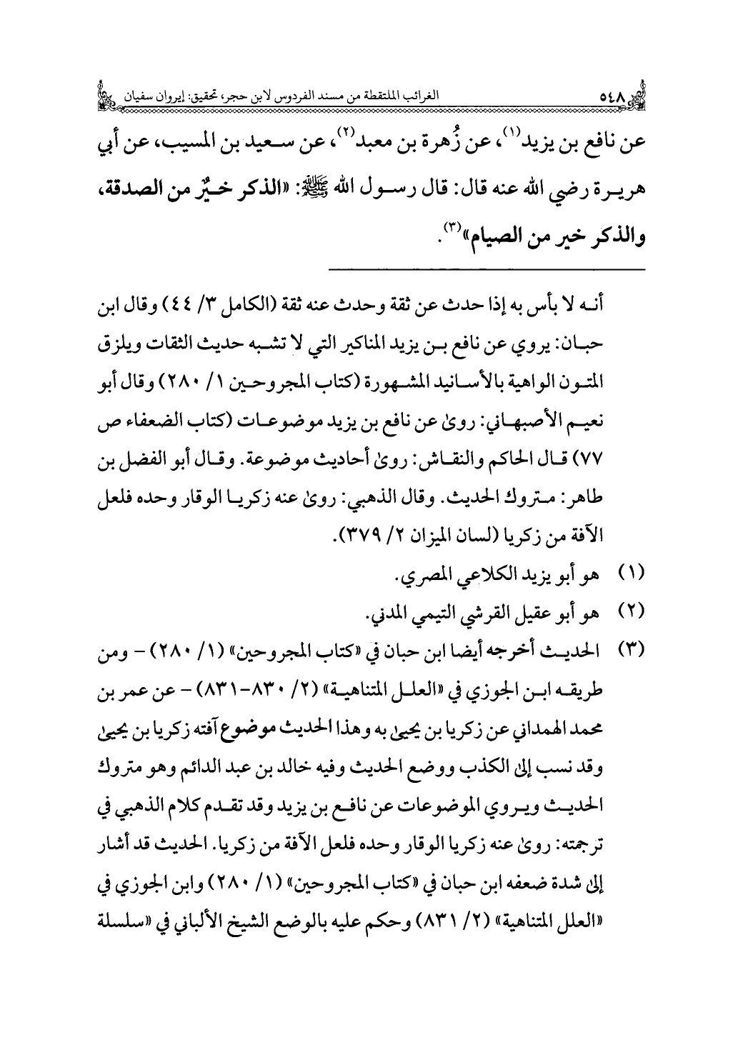 عن نافع بن يزيد (¬١)، عن زُهرة بن معبد (¬٢)، عن سعيد بن المسيب، عن أبي هريرة رضي الله عنه قال: قال رسول الله - صلى الله عليه وسلم -: "الذكر خيرٌ من الصدقة، والذكر خير من الصيام" (¬٣).