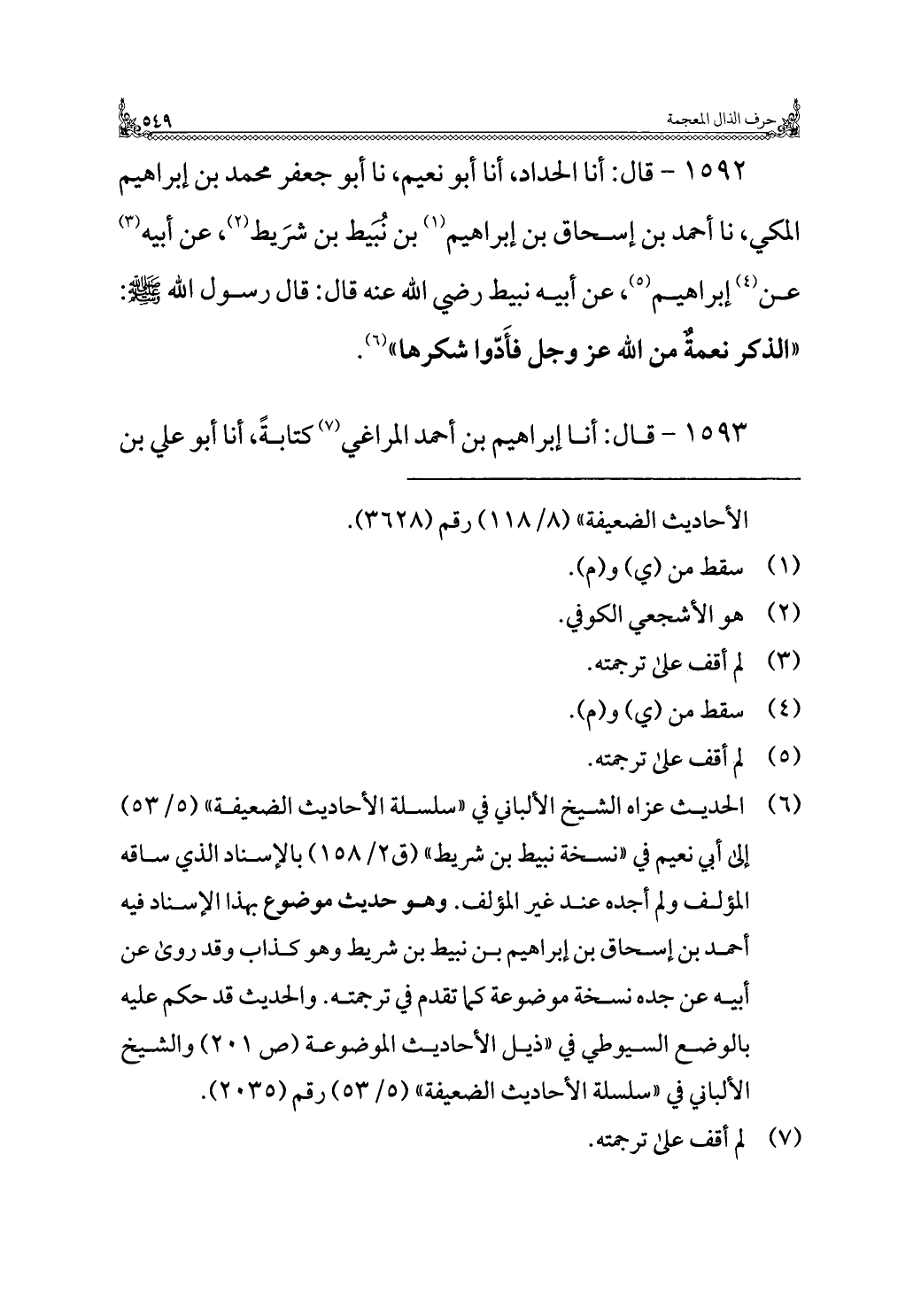 ١٥٩٢ - قال: أنا الحداد، أنا أبو نعيم، نا أبو جعفر محمد بن إبراهيم المكي، نا أحمد بن إسحاق بن إبراهيم (¬١) بن نُبَيط بن شرَيط (¬٢)، عن أبيه (¬٣) عن (¬٤) إبراهيم (¬٥)، عن أبيه نبيط رضي الله عنه قال: قال رسول الله - صلى الله عليه وسلم -: "الذكر نعمةٌ من الله عز وجل فأَدّوا شكرها" (¬٦).