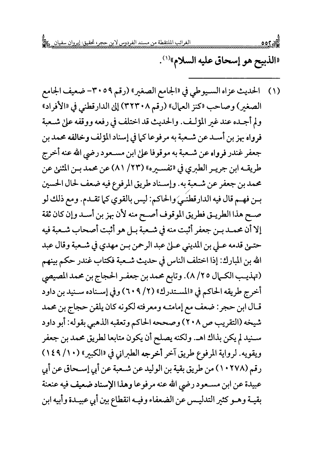 (¬١) الحديث عزاه السيوطي في "الجامع الصغير" (رقم ٣٠٥٩ - ضعيف الجامع الصغير) وصاحب "كنز العمال" (رقم ٣٢٣٠٨) إلى الدارقطني في "الأفراد" ولم أجده عند غير المؤلف. والحديث قد اختلف في رفعه ووقفه على شعبة فرواه بهز بن أسد عن شعبة به مرفوعًا كما في إسناد المؤلف وخالفه محمد بن جعفر غندر فرواه عن شعبة به موقوفًا على ابن مسعود رضي الله عنه أخرج طريقه ابن جرير الطبري في "تفسيره" (٢٣/ ٨١) عن محمد بن المثنى عن محمد بن جعفر عن شعبة به. وإسناد طريق المرفوع فيه ضعف لحال الحسين بن فهم قال فيه الدارقطني والحاكم: ليس بالقوي كما تقدم. ومع ذلك لو صح هذا الطريق فطريق الموقوف أصح منه لأن بهز بن أسد وإن كان ثقة إلا أن محمد بن جعفر أثبت منه في شعبة بل هو أثبت أصحاب شعبة فيه حتى قدمه علي بن المديني على عبد الرحمن بن مهدي في شعبة وقال عبد الله بن المبارك: إذا اختلف الناس في حديث شعبة فكتاب غندر حكم بينهم (تهذيب الكمال ٢٥/ ٨). وتابع محمد بن جعفر الحجاج بن محمد المصيصي أخرج طريقه الحاكم في "المستدرك" (٢/ ٦٠٩) وفي إسناده سنيد بن داود قال ابن حجر: ضعف مع إمامته ومعرفته لكونه كان يلقن حجاج بن محمد شيخه (التقريب ص ٢٠٨) وصححه الحاكم وتعقبه الذهبي بقوله: أبو داود سنيد لم يكن بذاك اهـ. ولكنه يصلح أن يكون متابعا لطريق محمد بن جعفر ويقويه. لرواية المرفوع طريق آخر أخرجه الطبراني في "الكبير" (١٠/ ١٤٩) رقم (١٠٢٧٨) من طريق بقية بن الوليد عن شعبة عن أبي إسحاق عن أبي عبيدة عن ابن مسعود رضي الله عنه مرفوعًا وهذا الإسناد ضعيف فيه عنعنة بقية وهو كثير التدليس عن الضعفاء وفيه انقطاع بين أبي عبيدة وأبيه ابن =