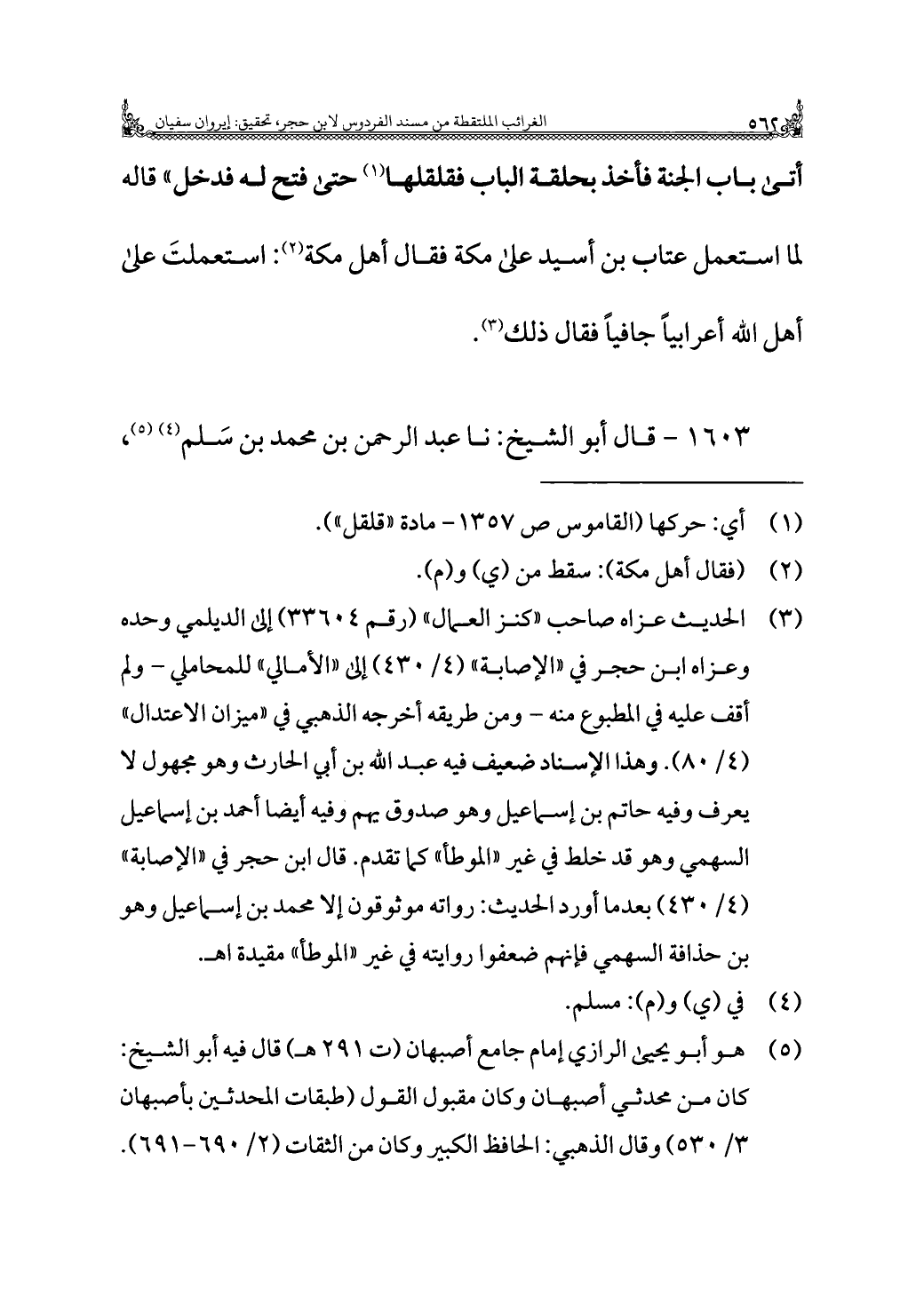 (¬٥) هو أبو يحيى الرازي إمام جامع أصبهان (ت ٢٩١ هـ) قال فيه أبو الشيخ: كان من محدثي أصبهان وكان مقبول القول (طبقات المحدثين بأصبهان ٣/ ٥٣٠) وقال الذهبي: الحافظ الكبير وكان من الثقات (٢/ ٦٩٠ - ٦٩١).