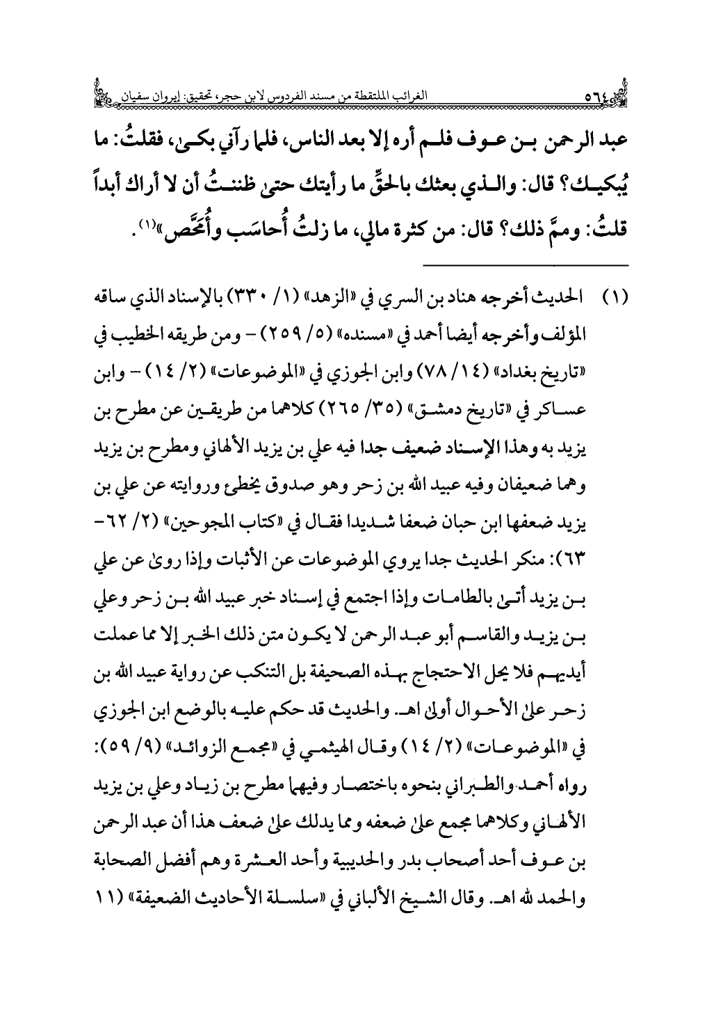(¬١) الحديث أخرجه هناد بن السري في "الزهد" (١/ ٣٣٠) بالإسناد الذي ساقه المؤلف وأخرجه أيضًا أحمد في "مسنده" (٥/ ٢٥٩) - ومن طريقه الخطيب في "تاريخ بغداد" (١٤/ ٧٨) وابن الجوزي في "الموضوعات" (٢/ ١٤) - وابن عساكر في "تاريخ دمشق" (٣٥/ ٢٦٥) كلاهما من طريقين عن مطرح بن يزيد به وهذا الإسناد ضعيف جدًا فيه علي بن يزيد الألهاني ومطرح بن يزيد وهما ضعيفان وفيه عبيد الله بن زحر وهو صدوق يخطئ وروايته عن علي بن يزيد ضعفها ابن حبان ضعفا شديدا فقال في "كتاب المجروحين" (٢/ ٦٢ - ٦٣): منكر الحديث جدًا يروي الموضوعات عن الأثبات وإذا روى عن علي بن يزيد أتى بالطامات وإذا اجتمع في إسناد خبر عبيد الله بن زحر وعلي بن يزيد والقاسم أبو عبد الرحمن لا يكون متن ذلك الخبر إلا مما عملت أيديهم فلا يحل الاحتجاج بهذه الصحيفة بل التنكب عن رواية عبيد الله بن زحر على الأحوال أولى اهـ. والحديث قد حكم عليه بالوضع ابن الجوزي في "الموضوعات" (٢/ ١٤) وقال الهيثمي في "مجمع الزوائد" (٩/ ٥٩): رواه أحمد والطبراني بنحوه باختصار وفيهما مطرح بن زياد وعلي بن يزيد الألهاني وكلاهما مجمع على ضعفه ومما يدلك على ضعف هذا أن عبد الرحمن بن عوف أحد أصحاب بدر والحديبية وأحد العشرة وهم أفضل الصحابة والحمد لله اهـ. وقال الشيخ الألباني في "سلسلة الأحاديث الضعيفة" (١١ =
