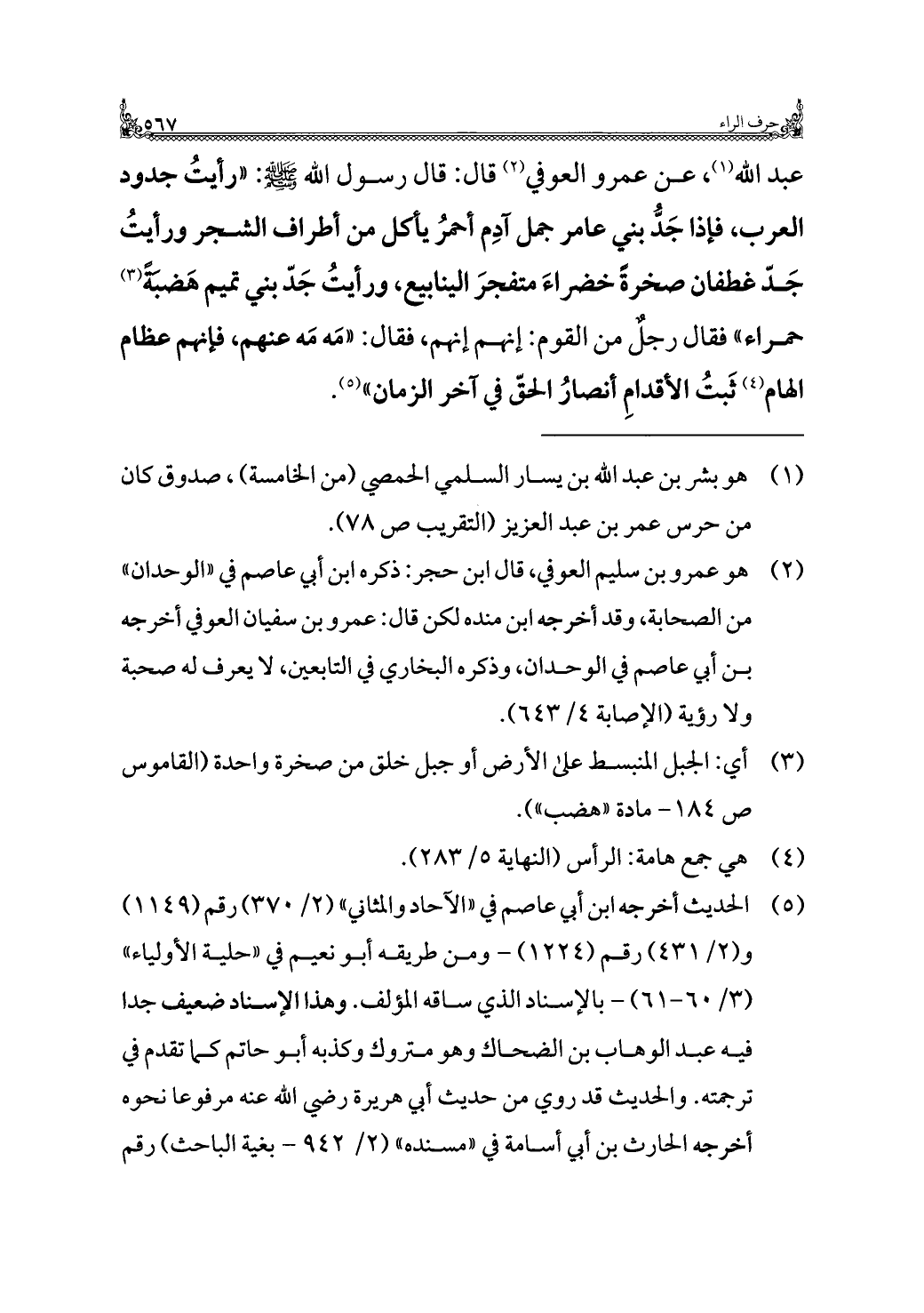 عبد الله (¬١)، عن عمرو العوفي (¬٢) قال: قال رسول الله - صلى الله عليه وسلم -: "رأيتُ جدود العرب، فإذا جَدُّ بني عامر جمل آدِم أحمرُ يأكل من أطراف الشجر ورأيتُ جَدّ غطفان صخرةً خضراءَ متفجرَ الينابيع، ورأيتُ جَدّ بني تميم هَضبَةً (¬٣) حمراء" فقال رجلٌ من القوم: إنهم إنهم، فقال: "مَه مَه عنهم، فإنهم عظام الهام (¬٤) ثَبتُ الأقدامِ أنصارُ الحقّ في آخر الزمان" (¬٥).