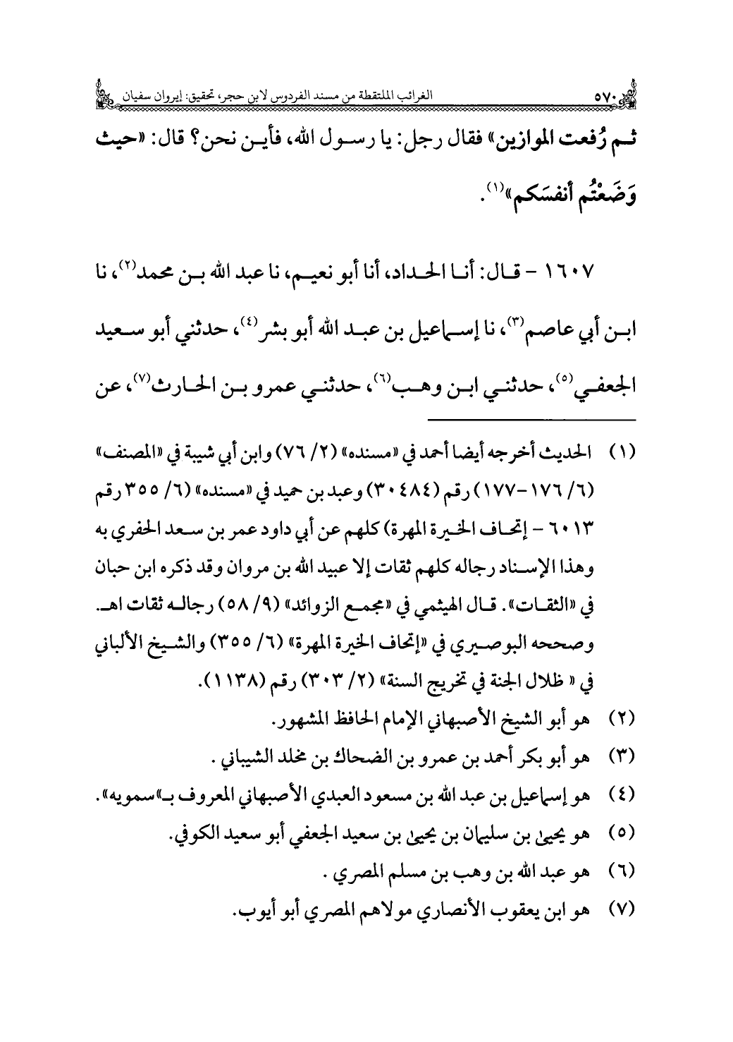 ١٦٠٧ - قال: أنا الحداد، أنا أبو نعيم، نا عبد الله بن محمد (¬٢)، نا ابن أبي عاصم (¬٣)، نا إسماعيل بن عبد الله أبو بشر (¬٤)، حدثني أبو سعيد الجعفي (¬٥)، حدثني ابن وهب (¬٦)، حدثني عمرو بن الحارث (¬٧)، عن