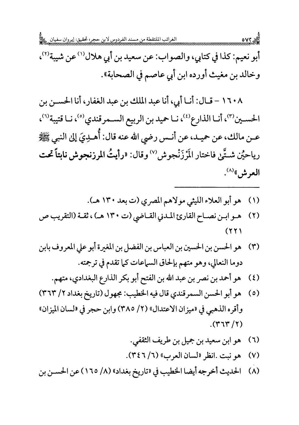 ١٦٠٨ - قال: أنا أبي، أنا عبد الملك بن عبد الغفار، أنا الحسن بن الحسين (¬٣)، أنا الذارع (¬٤)، نا حميد بن الربيع السمرقندي (¬٥)، نا قتيبة (¬٦)، عن مالك، عن حميد، عن أنس رضي الله عنه قال: أُهدِيَ إلى النبي - صلى الله عليه وسلم - رياحين شتَّى فاختار المَرْزَنْجوش (¬٧) وقال: "رأيتُ المرزنجوش نابتًا تحت العرش" (¬٨).