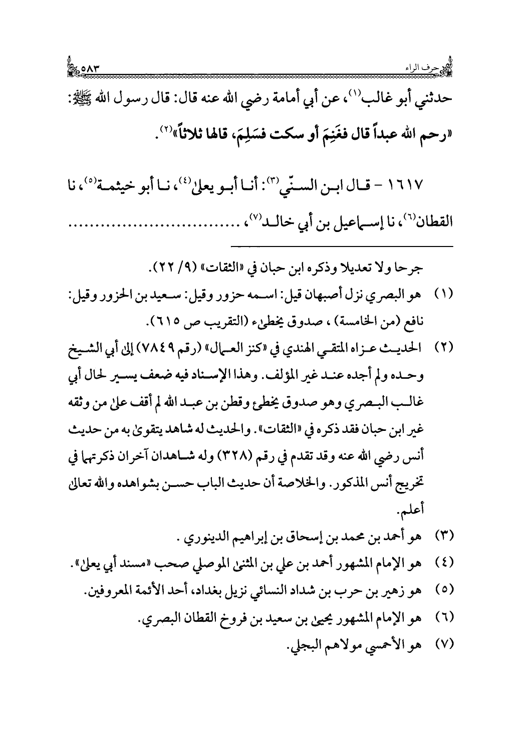 ١٦١٧ - قال ابن السنّي (¬٣): أنا أبو يعلى (¬٤)، نا أبو خيثمة (¬٥)، نا القطان (¬٦)، نا إسماعيل بن أبي خالد (¬٧)، . . . . . . .