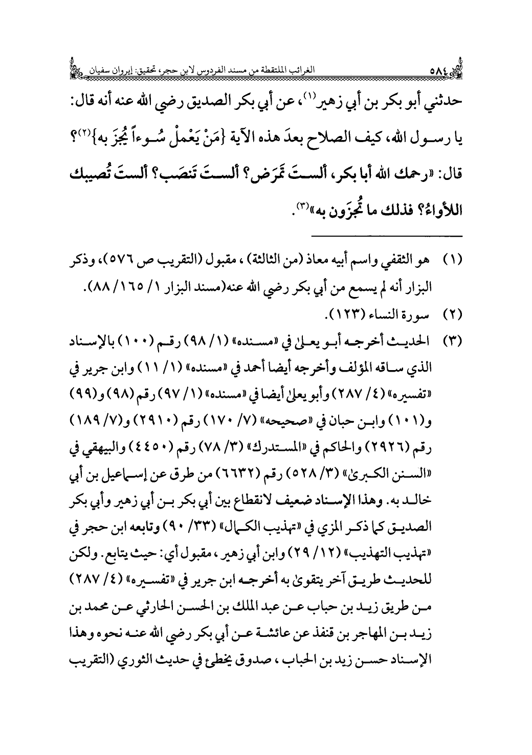 (¬٣) الحديث أخرجه أبو يعلى في "مسنده" (١/ ٩٨) رقم (١٠٠) بالإسناد الذي ساقه المؤلف وأخرجه أيضًا أحمد في "مسنده" (١/ ١١) وابن جرير في "تفسيره" (٤/ ٢٨٧) وأبو يعلى أيضًا في "مسنده" (١/ ٩٧) رقم (٩٨) و (٩٩) و (١٠١) وابن حبان في "صحيحه" (٧/ ١٧٠) رقم (٢٩١٠) و (٧/ ١٨٩) رقم (٢٩٢٦) والحاكم في "المستدرك" (٣/ ٧٨) رقم (٤٤٥٠) والبيهقي في "السنن الكبرى" (٣/ ٥٢٨) رقم (٦٦٣٢) من طرق عن إسماعيل بن أبي خالد به. وهذا الإسناد ضعيف لانقطاع بين أبي بكر بن أبي زهير وأبي بكر الصديق كما ذكر المزي في "تهذيب الكمال" (٣٣/ ٩٠) وتابعه ابن حجر في "تهذيب التهذيب" (١٢/ ٢٩) وابن أبي زهير، مقبول أي: حيث يتابع. ولكن للحديث طريق آخر يتقوى به أخرجه ابن جرير في "تفسيره" (٤/ ٢٨٧) من طريق زيد بن حباب عن عبد الملك بن الحسن الحارثي عن محمد بن زيد بن المهاجر بن قنفذ عن عائشة عن أبي بكر رضي الله عنه نحوه وهذا الإسناد حسن زيد بن الحباب، صدوق يخطئ في حديث الثوري (التقريب =