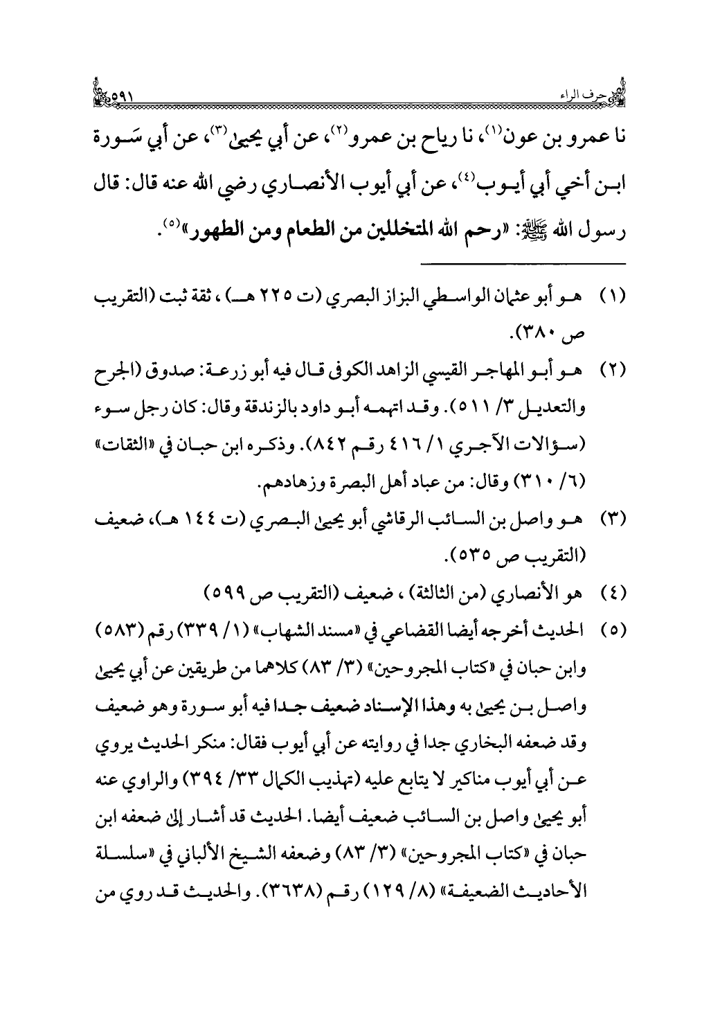 نا عمرو بن عون (¬١)، نا رياح بن عمرو (¬٢)، عن أبي يحيى (¬٣)، عن أبي سَورة ابن أخي أبي أيوب (¬٤)، عن أبي أيوب الأنصاري رضي الله عنه قال: قال رسول الله - صلى الله عليه وسلم -: "رحم الله المتخللين من الطعام ومن الطهور" (¬٥).
