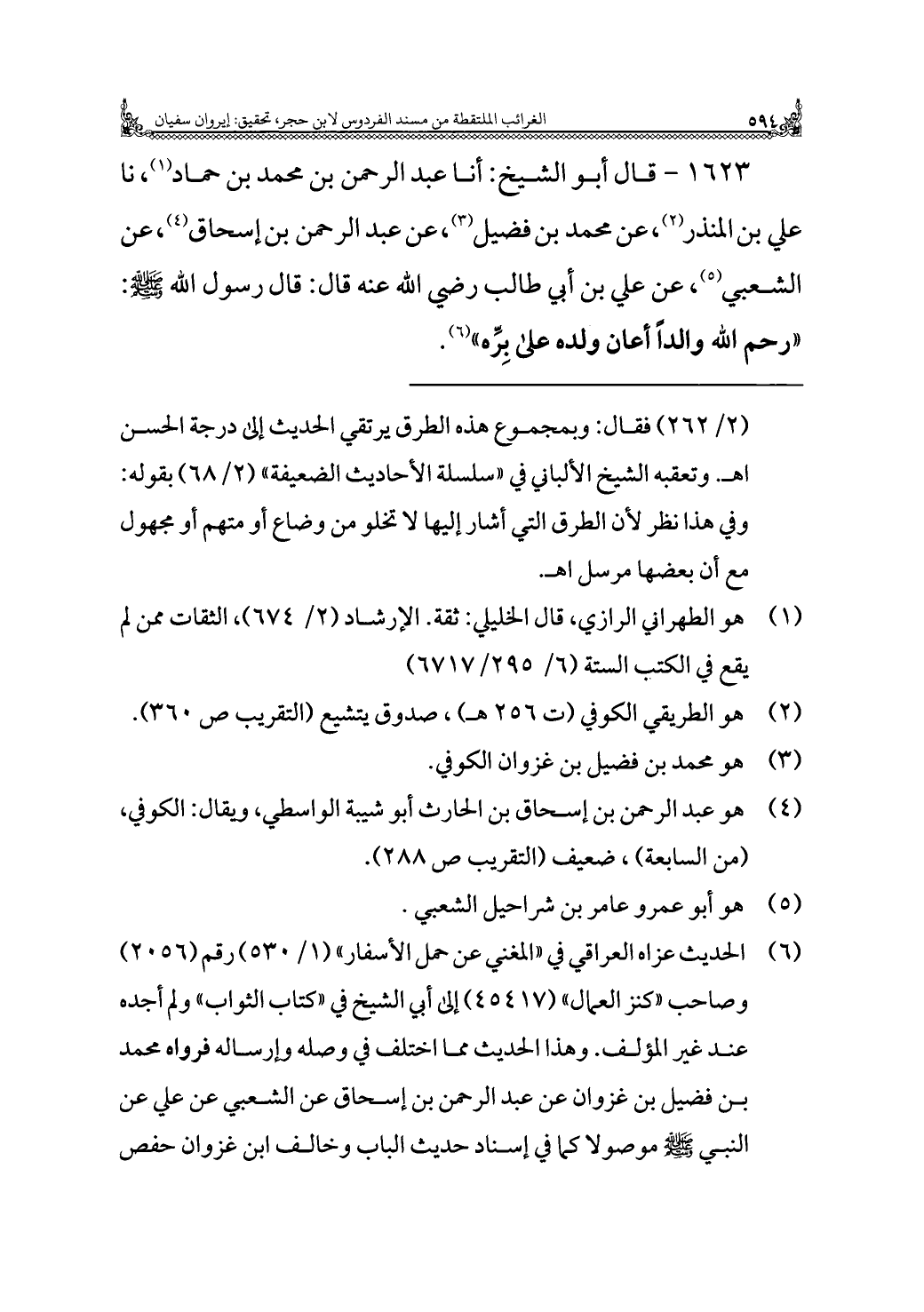 ١٦٢٣ - قال أبو الشيخ: أنا عبد الرحمن بن محمد بن حماد (¬١)، نا علي بن المنذر (¬٢)، عن محمد بن فضيل (¬٣)، عن عبد الرحمن بن إسحاق (¬٤)، عن الشعبي (¬٥)، عن علي بن أبي طالب رضي الله عنه قال: قال رسول الله - صلى الله عليه وسلم -: "رحم الله والدًا أعان ولده على بِرِّه" (¬٦).