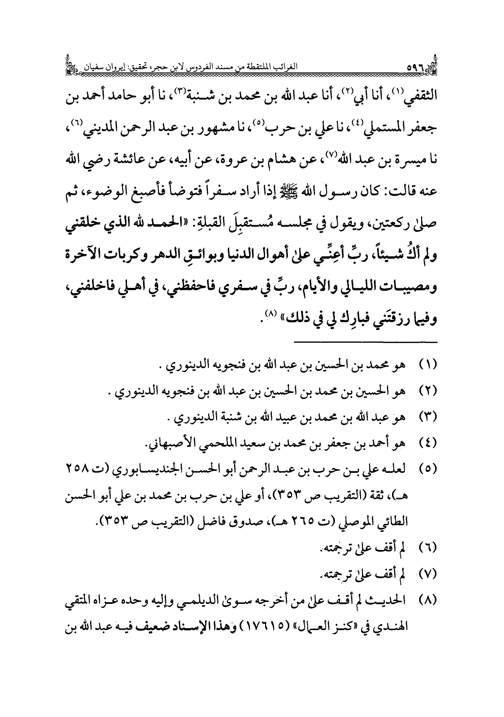 الثقفي (¬١)، أنا أبي (¬٢)، أنا عبد الله بن محمد بن شنبة (¬٣)، نا أبو حامد أحمد بن جعفر المستملي (¬٤)، نا علي بن حرب (¬٥)، نا مشهور بن عبد الرحمن المديني (¬٦)، نا ميسرة بن عبد الله (¬٧)، عن هشام بن عروة، عن أبيه، عن عائشة رضي الله عنها قالت: كان رسول الله - صلى الله عليه وسلم - إذا أراد سفرًا فتوضأ فأصبغ الوضوء، ثم صلى ركعتين، ويقول في مجلسه مُستقبِلَ القبلةِ: "الحمد لله الذي خلقني ولم أكُ شيئًا، ربِّ أعِنِّي على أهوال الدنيا وبوائقِ الدهر وكربات الآخرة ومصيبات الليالي والأيام، ربِّ في سفري فاحفظني، في أهلي فاخلفني، وفيما رزقتَني فبارِك لي في ذلك" (¬٨).