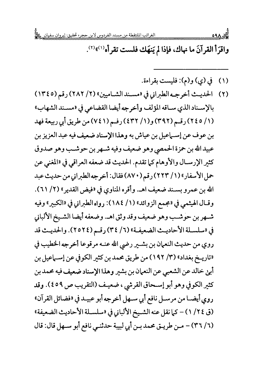 (¬٢) الحديث أخرجه الطبراني في "مسند الشاميين" (٢/ ٢٨٢) رقم (١٣٤٥) بالإسناد الذي ساقه المؤلف وأخرجه أيضًا القضاعي في "مسند الشهاب" (١/ ٢٤٥) رقم (٣٩٢) و (١/ ٤٣٢) رقم (٧٤١) من طريق أبي ربيعة فهد بن عوف عن إسماعيل بن عياش به وهذا الإسناد ضعيف فيه عبد العزيز بن عبيد الله بن حمزة الحمصي وهو ضعيف وفيه شهر بن حوشب وهو صدوق كثير الإرسال والأوهام كما تقدم. الحديث قد ضعفه العراقي في "المغني عن حمل الأسفار" (١/ ٢٢٣) رقم (٨٧٠) فقال: أخرجه الطبراني من حديث عبد الله بن عمرو بسند ضعيف اهـ. وأقره المناوي في "فيض القدير" (٢/ ٦١). وقال الهيثمي في "مجمع الزوائد" (١/ ١٨٤): رواه الطبراني في "الكبير" وفيه شهر بن حوشب وهو ضعيف وقد وثق اهـ. وضعفه أيضًا الشيخ الألباني في "سلسلة الأحاديث الضعيفة" (٦/ ٣٤) رقم (٢٥٢٤). والحديث قد روي من حديث النعمان بن بشير رضي الله عنه مرفوعًا أخرجه الخطيب في "تاريخ بغداد" (٣/ ١٩٢) من طريق محمد بن كثير الكوفي عن إسماعيل بن أبى خالد عن الشعبي عن النعمان بن بشير وهذا الإسناد ضعيف فيه محمد بن كثير الكوفي وهو أبو إسحاق القرشي، ضعيف (التقريب ص ٤٥٩). وقد روي أيضًا من مرسل نافع أبي سهل أخرجه أبو عبيد في "فضائل القرآن" (ق ٢٤/ ١) - كما نقل عنه الشيخ الألباني في "سلسلة الأحاديث الضعيفة" (٦/ ٣٦) - من طريق محمد بن أبي لبيبة حدثني نافع أبو سهل قال: قال =