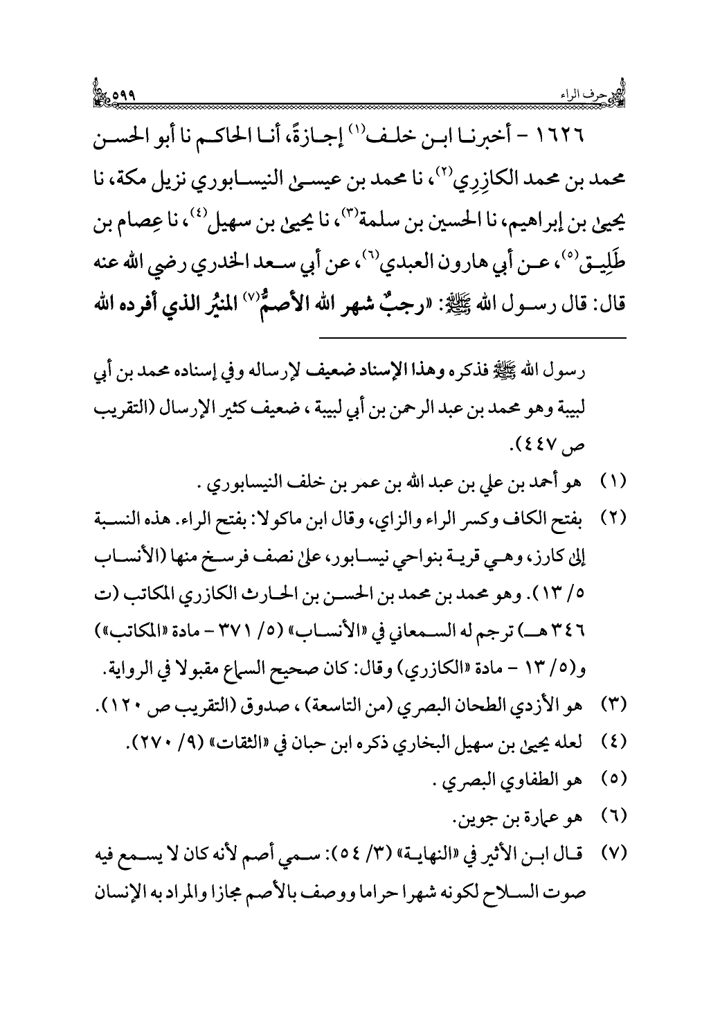 ١٦٢٦ - أخبرنا ابن خلف (¬١) إجازةً، أنا الحاكم نا أبو الحسن محمد بن محمد الكازِرِي (¬٢)، نا محمد بن عيسى النيسابوري نزيل مكة، نا يحيى بن إبراهيم، نا الحسين بن سلمة (¬٣)، نا يحيى بن سهيل (¬٤)، نا عِصام بن طَلِيق (¬٥)، عن أبي هارون العبدي (¬٦)، عن أبي سعد الخدري رضي الله عنه قال: قال رسول الله - صلى الله عليه وسلم -: "رجبٌ شهر الله الأصمُّ (¬٧) المنيرُ الذي أفرده الله