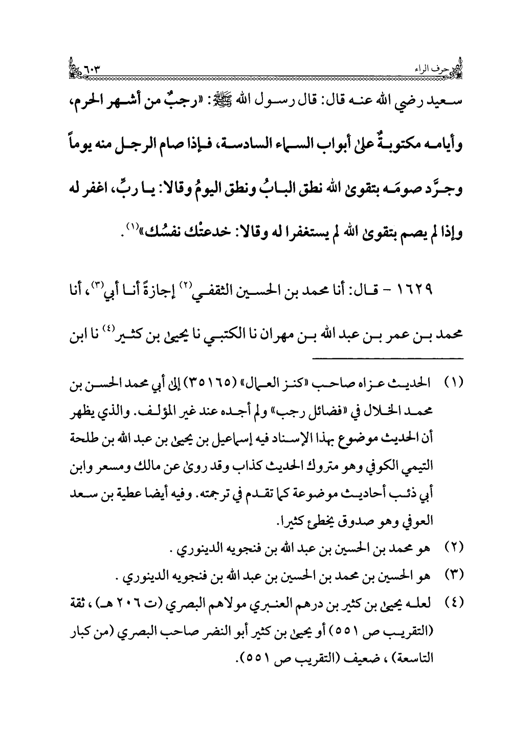 سعيد رضي الله عنه قال: قال رسول الله - صلى الله عليه وسلم -: "رجبٌ من أشهر الحرم، وأيامه مكتوبةٌ على أبواب السماء السادسة، فإذا صام الرجل منه يومًا وجرَّد صومَه بتقوى الله نطق البابُ ونطق اليومُ وقالا: يا ربِّ، اغفر له وإذا لم يصم بتقوى الله لم يستغفرا له وقالا: خدعتْك نفسُك" (¬١).