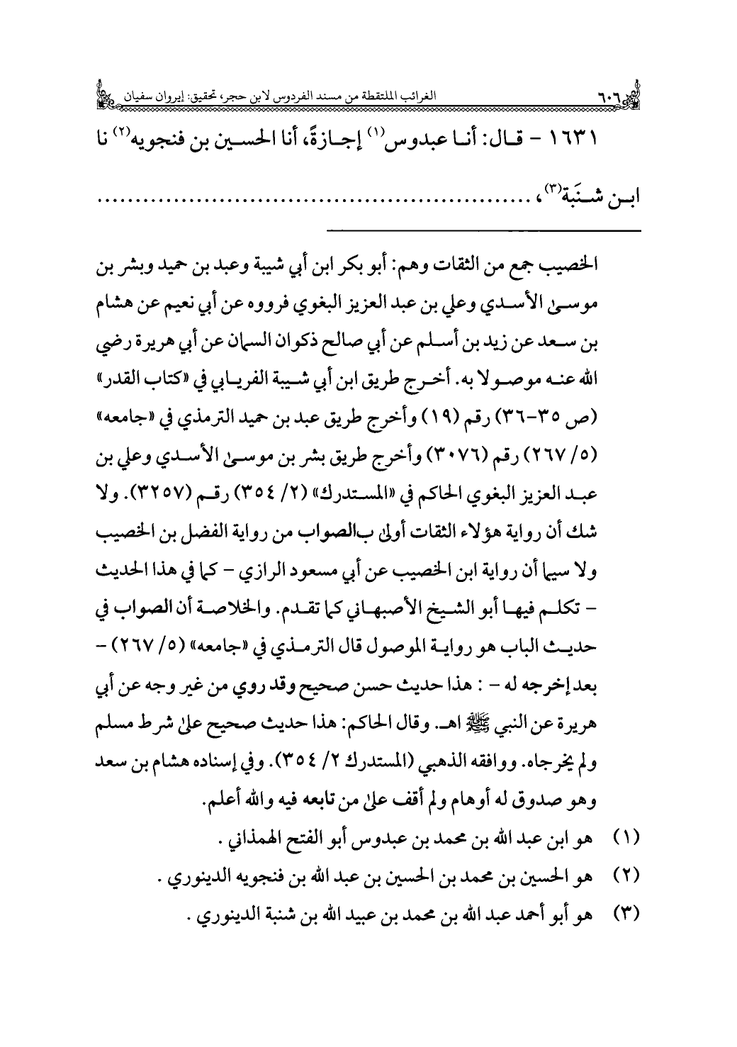 = الخصيب جمع من الثقات وهم: أبو بكر ابن أبي شيبة وعبد بن حميد وبشر بن موسى الأسدي وعلي بن عبد العزيز البغوي فرووه عن أبي نعيم عن هشام بن سعد عن زيد بن أسلم عن أبي صالح ذكوان السمان عن أبي هريرة رضي الله عنه موصولا به. أخرج طريق ابن أبي شيبة الفريابي في "كتاب القدر" (ص ٣٥ - ٣٦) رقم (١٩) وأخرج طريق عبد بن حميد الترمذي في "جامعه" (٥/ ٢٦٧) رقم (٣٠٧٦) وأخرج طريق بشر بن موسى الأسدي وعلي بن عبد العزيز البغوي الحاكم في "المستدرك" (٢/ ٣٥٤) رقم (٣٢٥٧). ولا شك أن رواية هؤلاء الثقات أولى بالصواب من رواية الفضل بن الخصيب ولا سيما أن رواية ابن الخصيب عن أبي مسعود الرازي - كما في هذا الحديث - تكلم فيها أبو الشيخ الأصبهاني كما تقدم. والخلاصة أن الصواب في حديث الباب هو رواية الموصول قال الترمذي في "جامعه" (٥/ ٢٦٧) - بعد إخراجه له -: هذا حديث حسن صحيح وقد روي من غير وجه عن أبي هريرة عن النبي - صلى الله عليه وسلم - اهـ. وقال الحاكم: هذا حديث صحيح على شرط مسلم ولم يخرجاه. ووافقه الذهبي (المستدرك ٢/ ٣٥٤). وفي إسناده هشام بن سعد وهو صدوق له أوهام ولم أقف على من تابعه فيه والله أعلم.