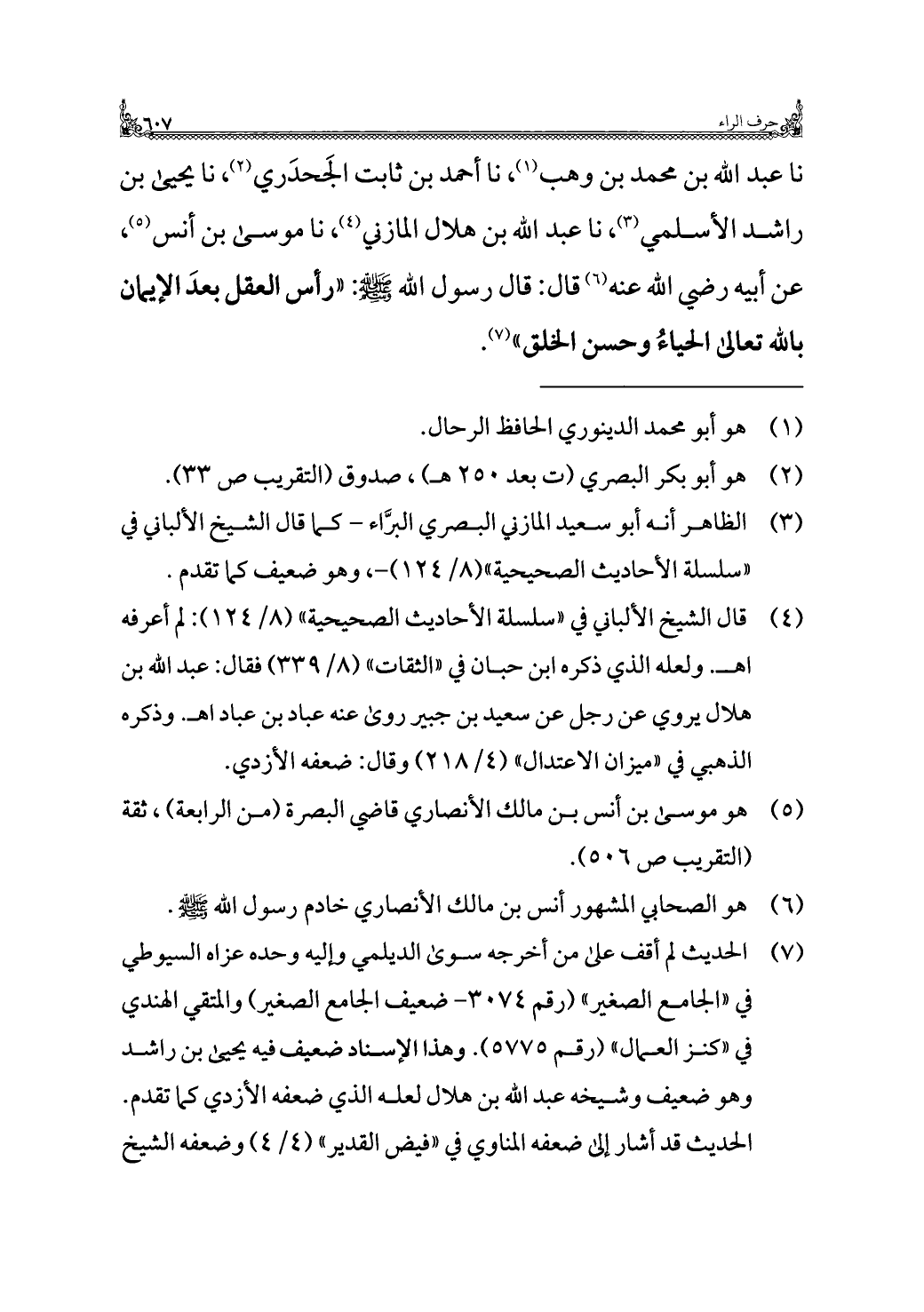نا عبد الله بن محمد بن وهب (¬١)، نا أحمد بن ثابت الجَحدَري (¬٢)، نا يحيى بن راشد الأسلمي (¬٣)، نا عبد الله بن هلال المازني (¬٤)، نا موسى بن أنس (¬٥)، عن أبيه رضي الله عنه (¬٦) قال: قال رسول الله - صلى الله عليه وسلم -: "رأس العقل بعدَ الإيمان بالله تعالى الحياءُ وحسن الخلق" (¬٧).