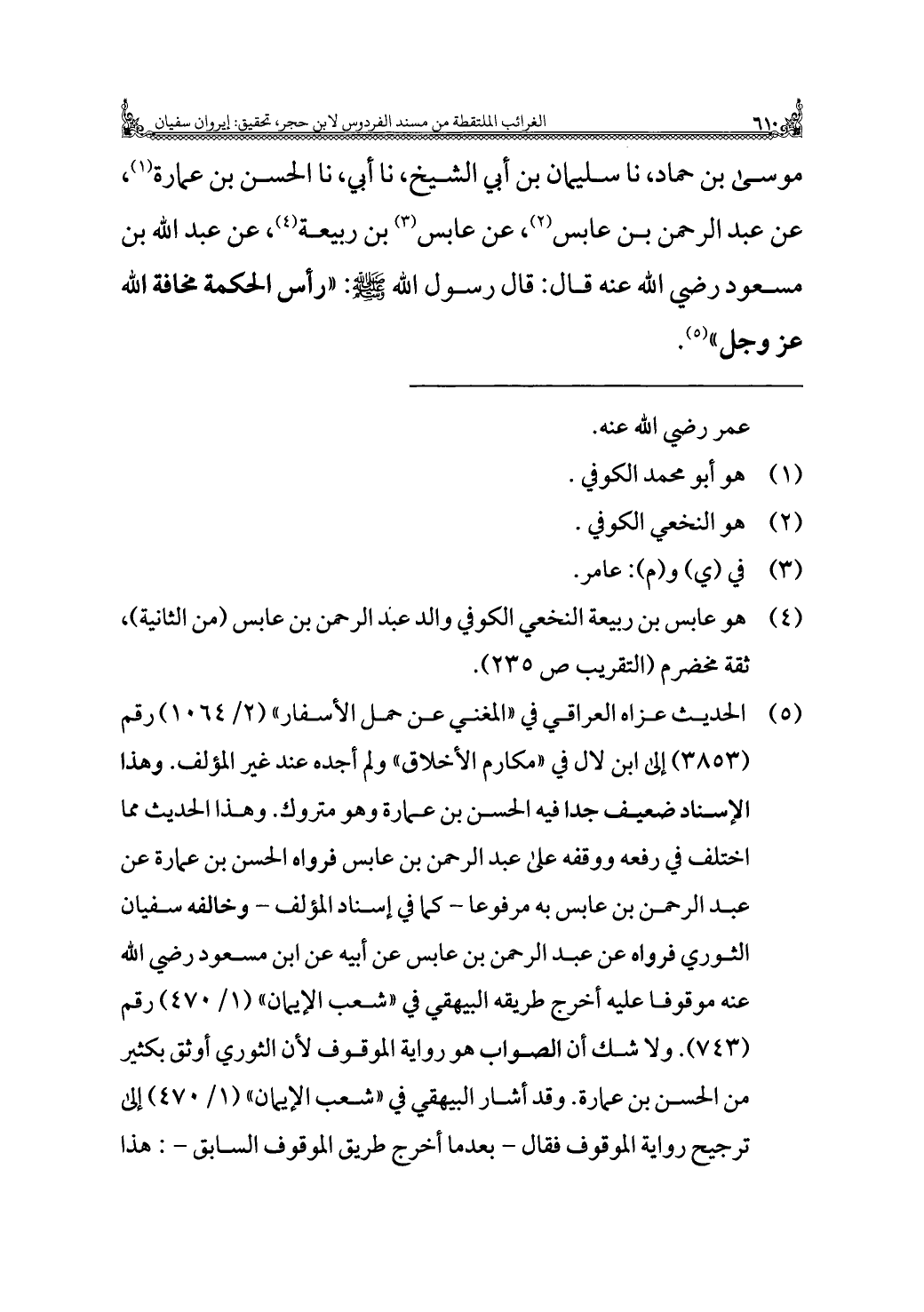 موسى بن حماد، نا سليمان بن أبي الشيخ، نا أبي، نا الحسن بن عمارة (¬١)، عن عبد الرحمن بن عابس (¬٢)، عن عابس (¬٣) بن ربيعة (¬٤)، عن عبد الله بن مسعود رضي الله عنه قال: قال رسول الله - صلى الله عليه وسلم -: "رأس الحكمة مخافة الله عز وجل" (¬٥).
