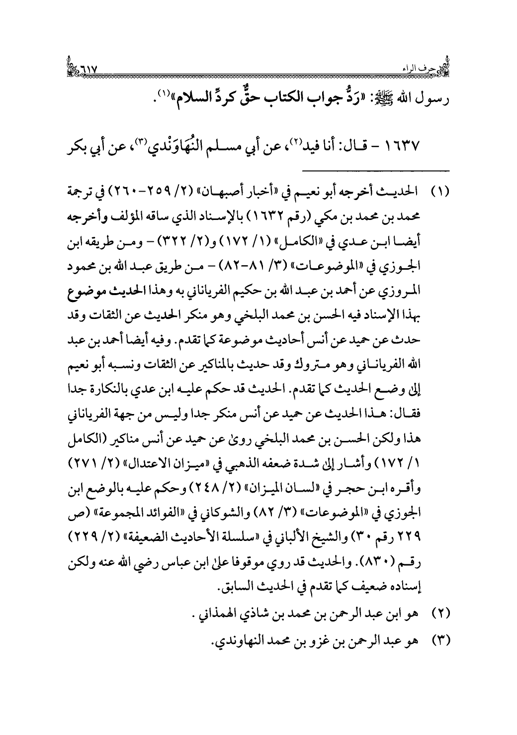(¬١) الحديث أخرجه أبو نعيم في "أخبار أصبهان" (٢/ ٢٥٩ - ٢٦٠) في ترجمة محمد بن محمد بن مكي (رقم ١٦٣٢) بالإسناد الذي ساقه المؤلف وأخرجه أيضًا ابن عدي في "الكامل" (١/ ١٧٢) و (٢/ ٣٢٢) - ومن طريقه ابن الجوزي في "الموضوعات" (٣/ ٨١ - ٨٢) - من طريق عبد الله بن محمود المروزي عن أحمد بن عبد الله بن حكيم الفرياناني به وهذا الحديث موضوع بهذا الإسناد فيه الحسن بن محمد البلخي وهو منكر الحديث عن الثقات وقد حدث عن حميد عن أنس أحاديث موضوعة كما تقدم. وفيه أيضًا أحمد بن عبد الله الفرياناني وهو متروك وقد حديث بالمناكير عن الثقات ونسبه أبو نعيم إلى وضع الحديث كما تقدم. الحديث قد حكم عليه ابن عدي بالنكارة جدًا فقال: هذا الحديث عن حميد عن أنس منكر جدًا وليس من جهة الفرياناني هذا ولكن الحسن بن محمد البلخي روى عن حميد عن أنس مناكير (الكامل ١/ ١٧٢) وأشار إلى شدة ضعفه الذهبي في "ميزان الاعتدال" (٢/ ٢٧١) وأقره ابن حجر في "لسان الميزان" (٢/ ٢٤٨) وحكم عليه بالوضع ابن الجوزي في "الموضوعات" (٣/ ٨٢) والشوكاني في "الفوائد المجموعة" (ص ٢٢٩ رقم ٣٠) والشيخ الألباني في "سلسلة الأحاديث الضعيفة" (٢/ ٢٢٩) رقم (٨٣٠). والحديث قد روي موقوفًا على ابن عباس رضي الله عنه ولكن إسناده ضعيف كما تقدم في الحديث السابق.