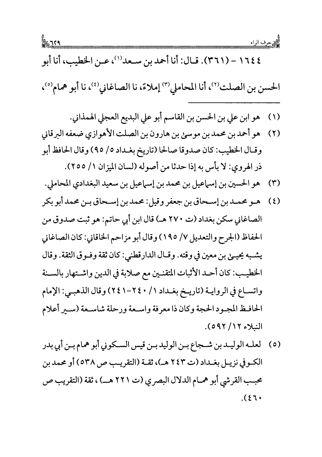 ١٦٤٤ - (٣٦١). قال: أنا أحمد بن سعد (¬١)، عن الخطيب، أنا أبو الحسن بن الصلت (¬٢)، أنا المحاملي (¬٣) إملاءً، نا الصاغاني (¬٤)، نا أبو همام (¬٥)،