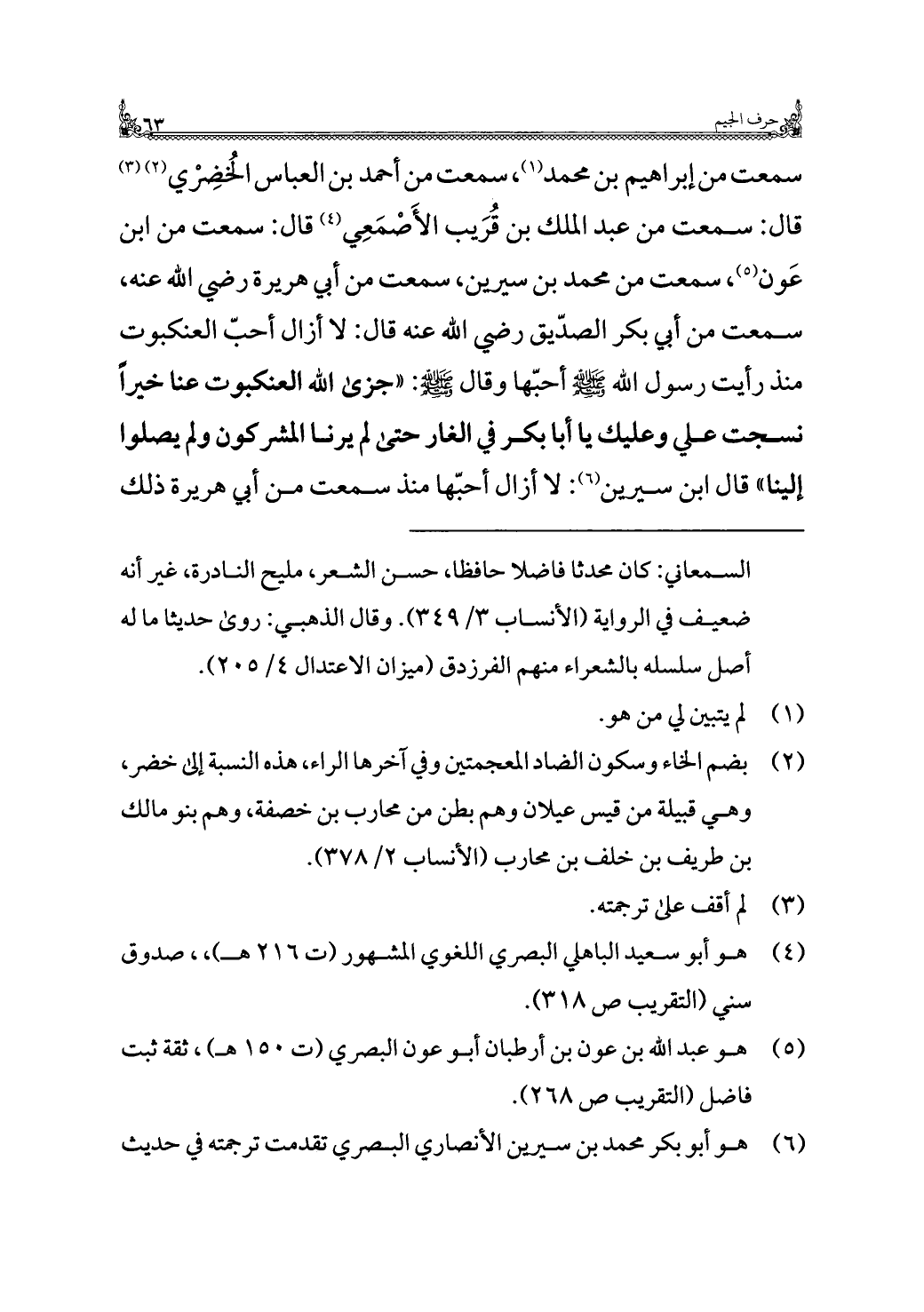 سمعت من إبراهيم بن محمد (¬١)، سمعت من أحمد بن العباس الخُضِرْي (¬٢) (¬٣) قال: سمعت من عبد الملك بن قُرَيب الأَصْمَعِي (¬٤) قال: سمعت من ابن عَون (¬٥)، سمعت من محمد بن سيرين، سمعت من أبي هريرة رضي الله عنه، سمعت من أبي بكر الصدّيق رضي الله عنه قال: لا أزال أحبّ العنكبوت منذ رأيت رسول الله - صلى الله عليه وسلم - أحبّها وقال - صلى الله عليه وسلم -: "جزى الله العنكبوت عنا خيرًا نسجت علي وعليك يا أبا بكر في الغار حتى لم يرنا المشركون ولم يصلوا إلينا" قال ابن سيرين (¬٦): لا أزال أحبّها منذ سمعت من أبي هريرة ذلك
