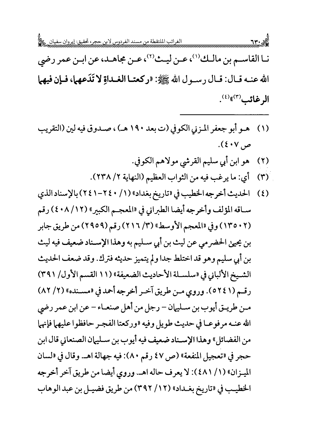 نا القاسم بن مالك (¬١)، عن ليث (¬٢)، عن مجاهد، عن ابن عمر رضي الله عنه قال: قال رسول الله - صلى الله عليه وسلم -: "ركعتا الغداةِ لا تَدَعهما، فإن فيهما الرغائب (¬٣) " (¬٤).