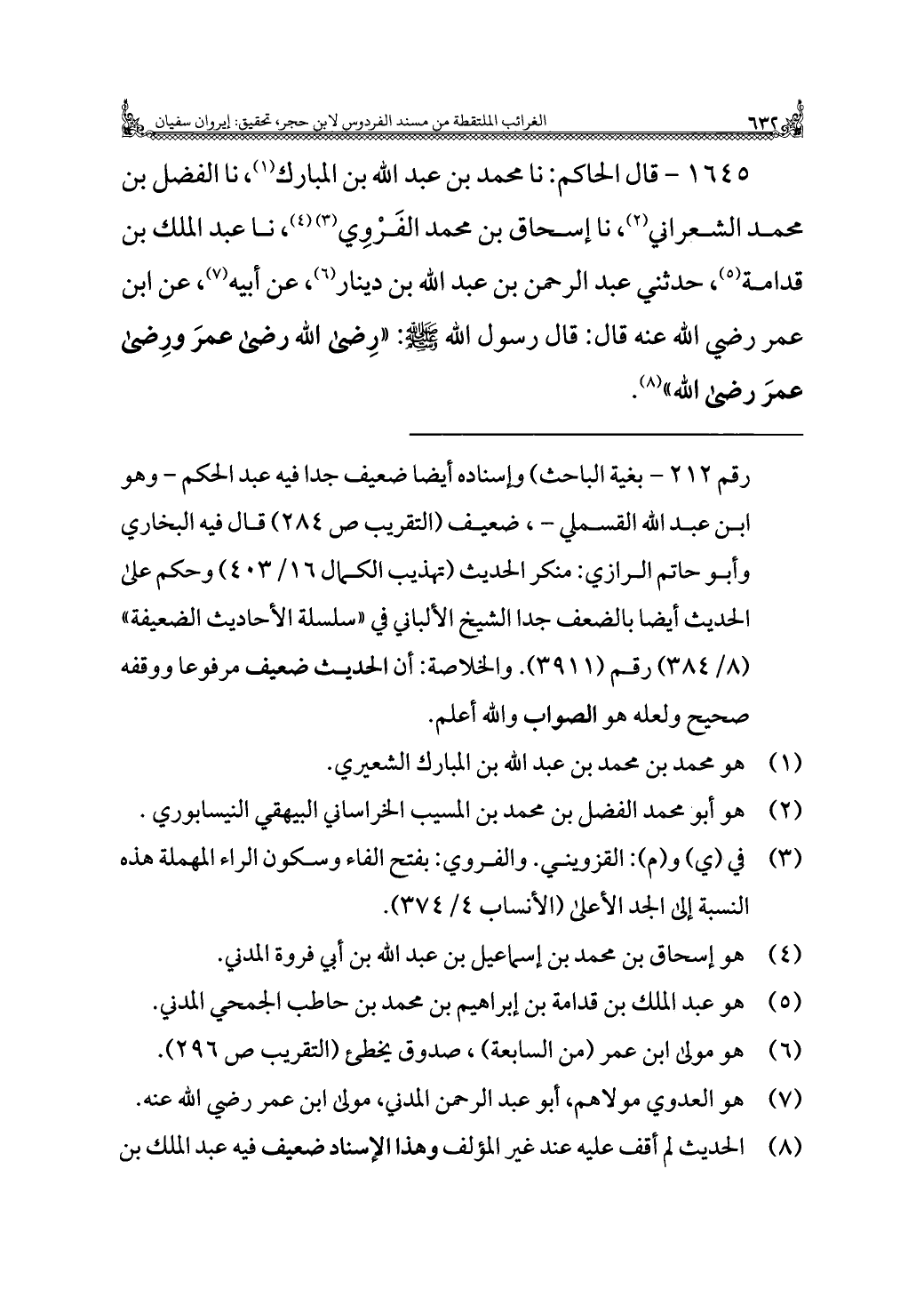 ١٦٤٥ - قال الحاكم: نا محمد بن عبد الله بن المبارك (¬١)، نا الفضل بن محمد الشعراني (¬٢)، نا إسحاق بن محمد الفَرْوِي (¬٣) (¬٤)، نا عبد الملك بن قدامة (¬٥)، حدثني عبد الرحمن بن عبد الله بن دينار (¬٦)، عن أبيه (¬٧)، عن ابن عمر رضي الله عنه قال: قال رسول الله - صلى الله عليه وسلم -: "رِضى الله رضى عمرَ ورِضى عمرَ رضى الله" (¬٨).
