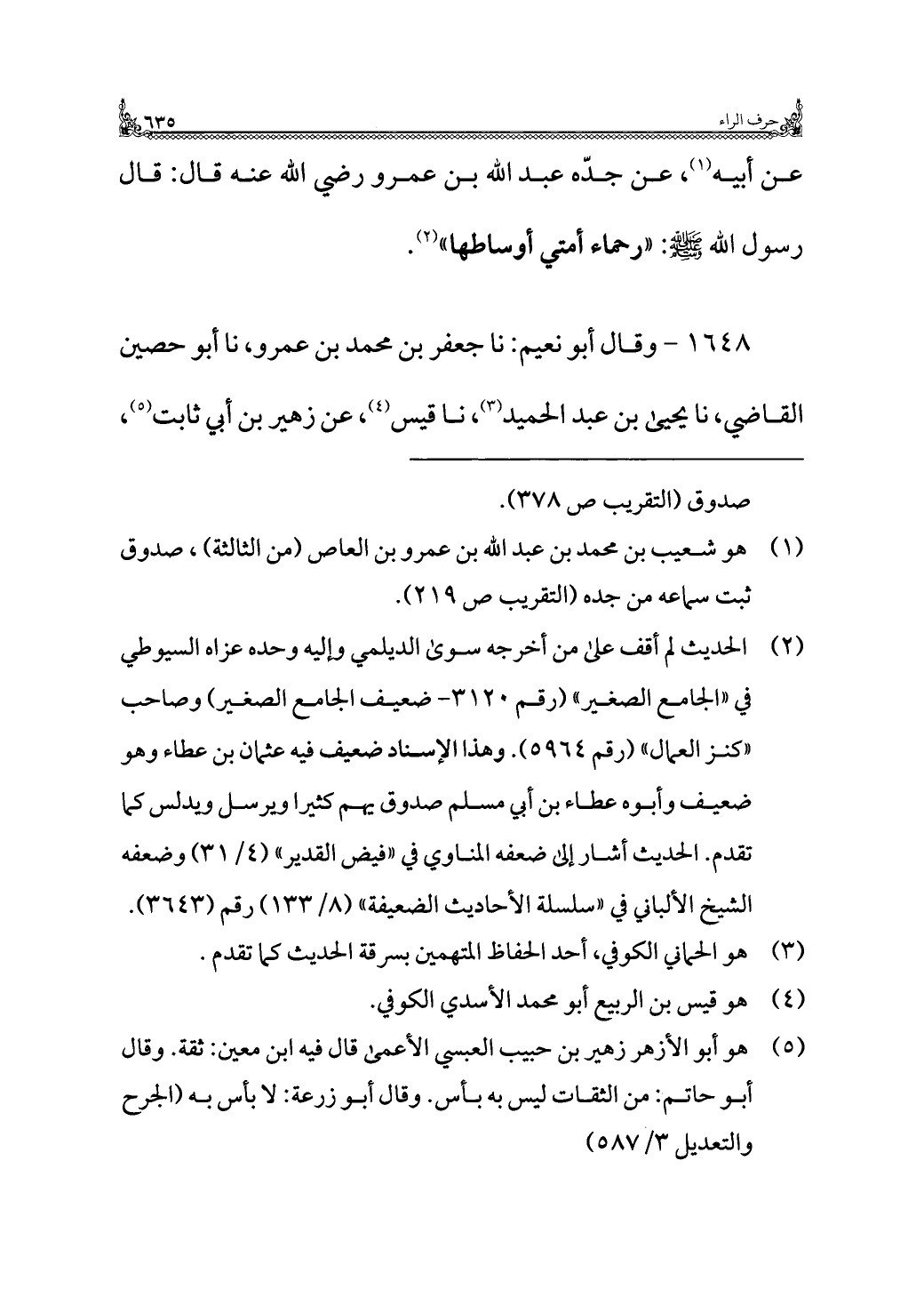 عن أبيه (¬١)، عن جدّه عبد الله بن عمرو رضي الله عنه قال: قال رسول الله - صلى الله عليه وسلم -: "رحماء أمتي أوساطها" (¬٢).