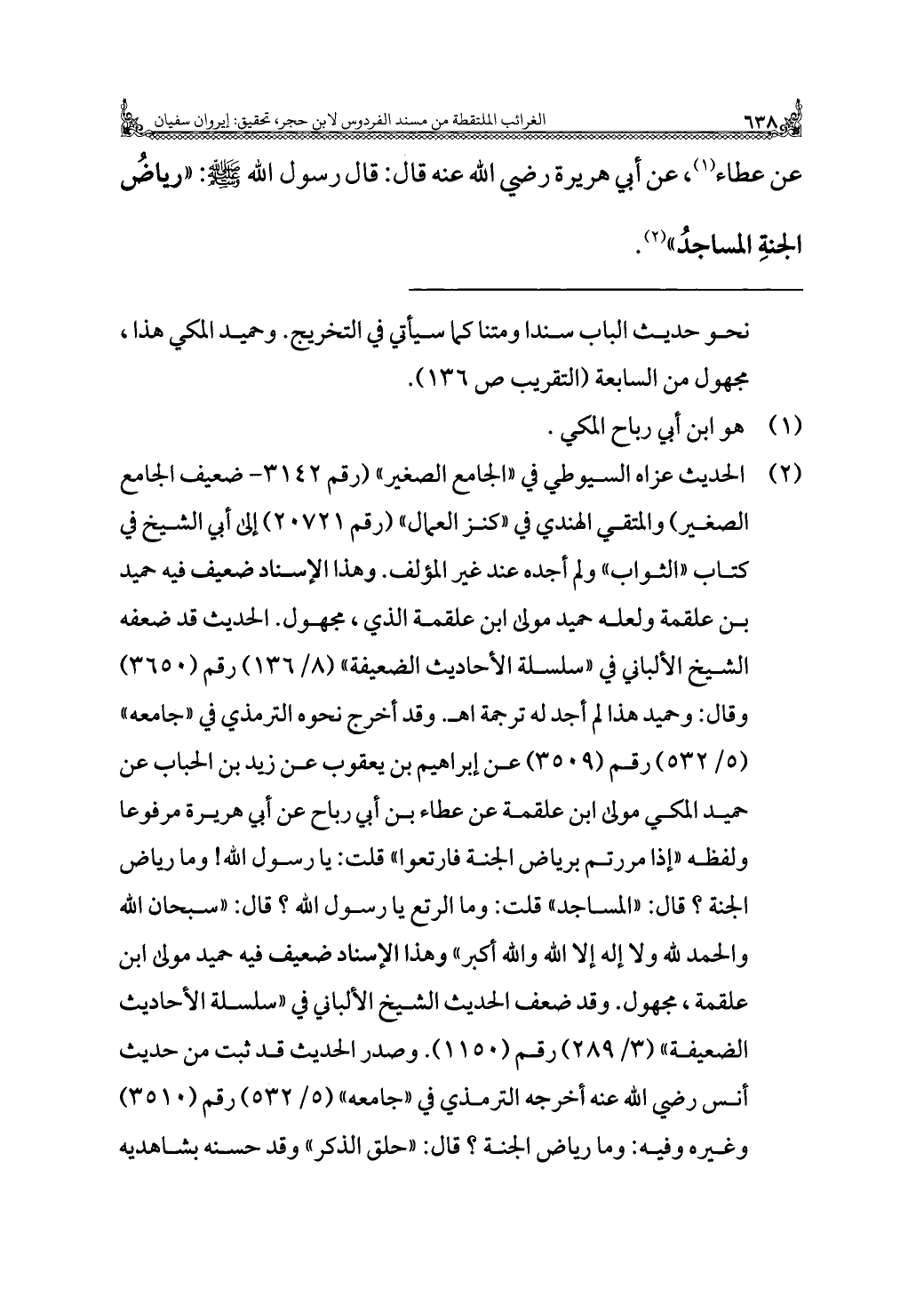 عن عطاء (¬١)، عن أبي هريرة رضي الله عنه قال: قال رسول الله - صلى الله عليه وسلم -: "رياضُ الجنةِ المساجدُ" (¬٢).