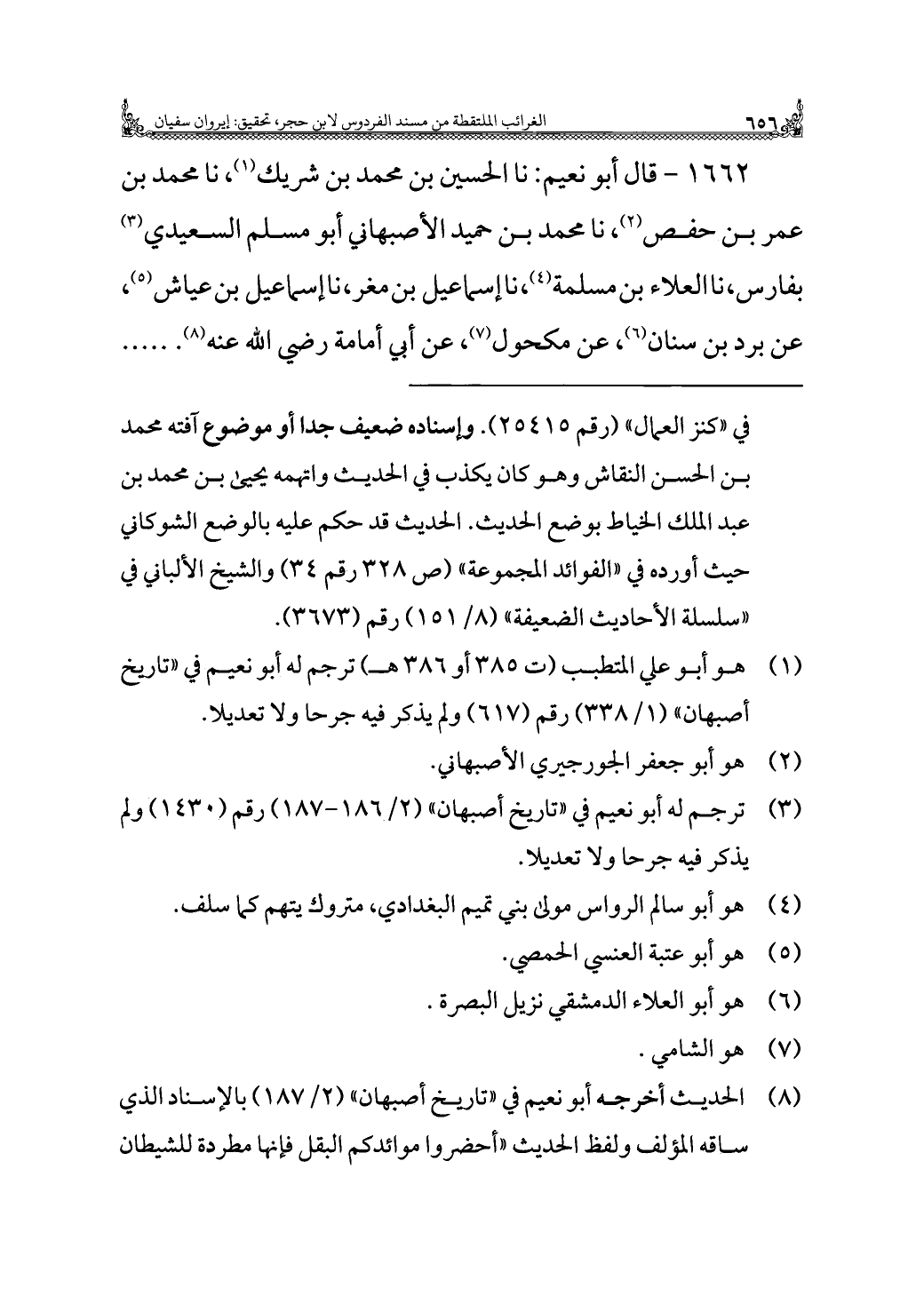 ١٦٦٢ - قال أبو نعيم: نا الحسين بن محمد بن شريك (¬١)، نا محمد بن عمر بن حفص (¬٢)، نا محمد بن حميد الأصبهاني أبومسلم السعيدي (¬٣) بفارس، نا العلاء بن مسلمة (¬٤)، نا إسماعيل بن مغر، نا إسماعيل بن عياش (¬٥)، عن برد بن سنان (¬٦)، عن مكحول (¬٧)، عن أبي أمامة رضي الله عنه (¬٨). . . . . .
