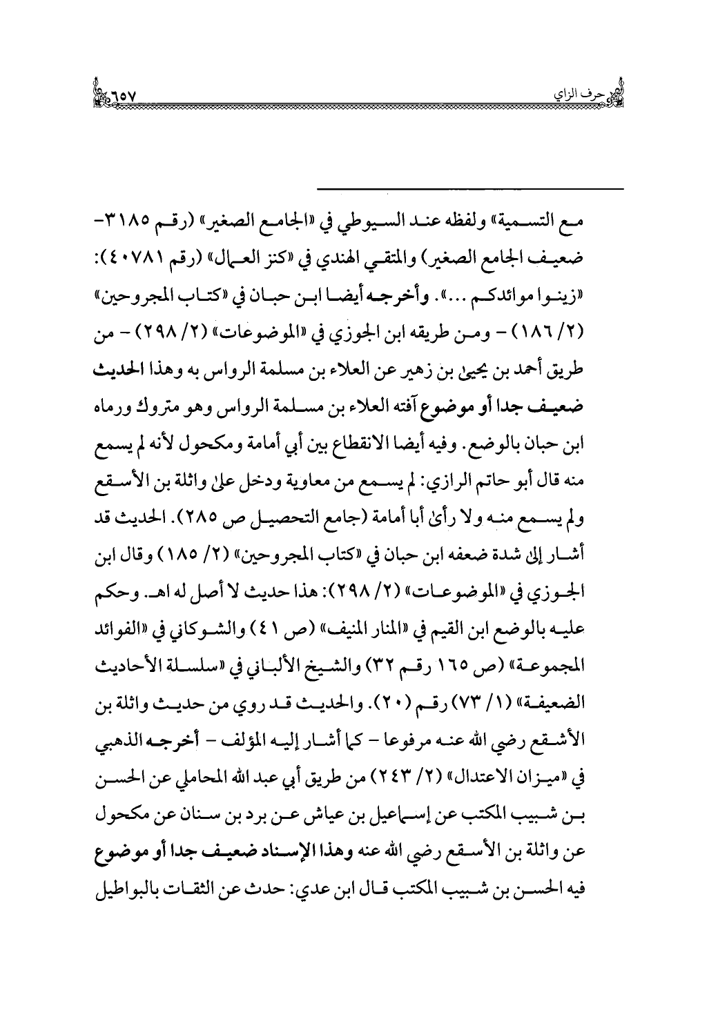 = مع التسمية" ولفظه عند السيوطي في "الجامع الصغير" (رقم ٣١٨٥ - ضعيف الجامع الصغير) والمتقي الهندي في "كنز العمال" (رقم ٤٠٧٨١): "زينوا موائدكم. . .". وأخرجه أيضًا ابن حبان في "كتاب المجروحين" (٢/ ١٨٦) - ومن طريقه ابن الجوزي في "الموضوعات" (٢/ ٢٩٨) - من طريق أحمد بن يحيى بن زهير عن العلاء بن مسلمة الرواس به وهذا الحديث ضعيف جدًا أو موضوع آفته العلاء بن مسلمة الرواس وهو متروك ورماه ابن حبان بالوضع. وفيه أيضًا الانقطاع بين أبي أمامة ومكحول لأنه لم يسمع منه قال أبو حاتم الرازي: لم يسمع من معاوية ودخل على واثلة بن الأسقع ولم يسمع منه ولا رأى أبا أمامة (جامع التحصيل ص ٢٨٥). الحديث قد أشار إلى شدة ضعفه ابن حبان في "كتاب المجروحين" (٢/ ١٨٥) وقال ابن الجوزي في "الموضوعات" (٢/ ٢٩٨): هذا حديث لا أصل له اهـ. وحكم عليه بالوضع ابن القيم في "المنار المنيف" (ص ٤١) والشوكاني في "الفوائد المجموعة" (ص ١٦٥ رقم ٣٢) والشيخ الألباني في "سلسلة الأحاديث الضعيفة" (١/ ٧٣) رقم (٢٠). والحديث قد روي من حديث واثلة بن الأسقع رضي الله عنه مرفوعًا - كما أشار إليه المؤلف - أخرجه الذهبي في "ميزان الاعتدال" (٢/ ٢٤٣) من طريق أبي عبد الله المحاملي عن الحسن بن شبيب المكتب عن إسماعيل بن عياش عن برد بن سنان عن مكحول عن واثلة بن الأسقع رضي الله عنه وهذا الإسناد ضعيف جدًا أو موضوع فيه الحسن بن شبيب المكتب قال ابن عدي: حدث عن الثقات بالبواطيل =