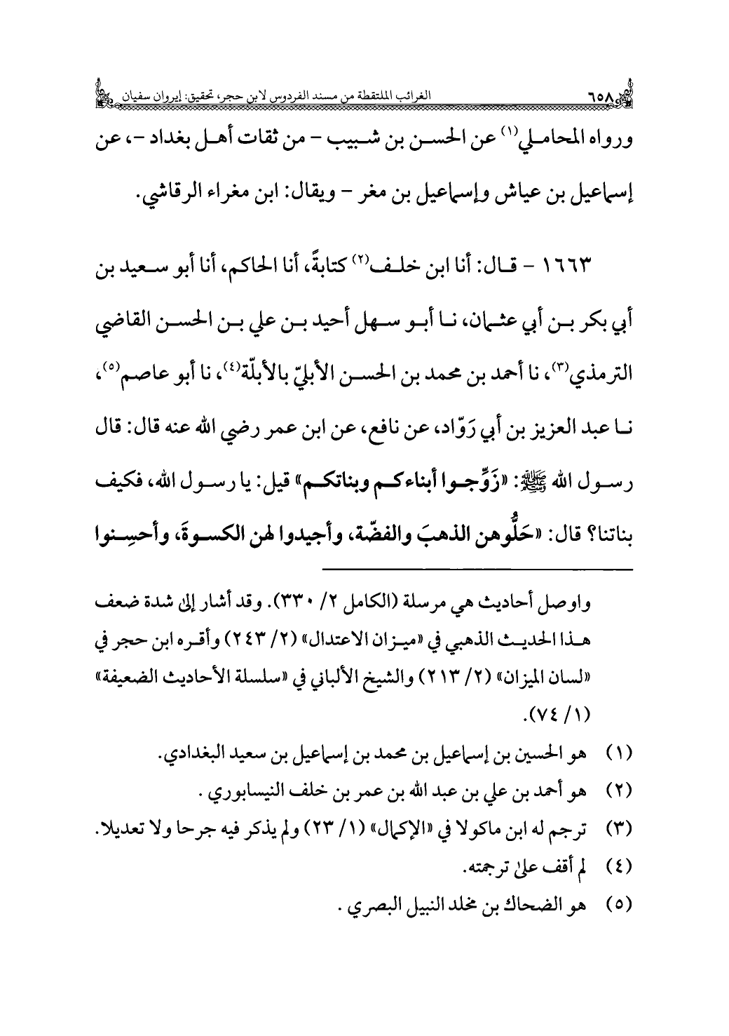 ١٦٦٣ - قال: أنا ابن خلف (¬٢) كتابةً، أنا الحاكم، أنا أبو سعيد بن أبي بكر بن أبي عثمان، نا أبو سهل أحيد بن علي بن الحسن القاضي الترمذي (¬٣)، نا أحمد بن محمد بن الحسن الأبليّ بالأبلّة (¬٤)، نا أبو عاصم (¬٥)، نا عبد العزيز بن أبي رَوّاد، عن نافع، عن ابن عمر رضي الله عنه قال: قال رسول الله - صلى الله عليه وسلم -: "زَوِّجوا أبناءكم وبناتكم" قيل: يا رسول الله، فكيف بناتنا؟ قال: "حَلُّوهن الذهبَ والفضّة، وأجيدوا لهن الكسوةَ، وأحسِنوا