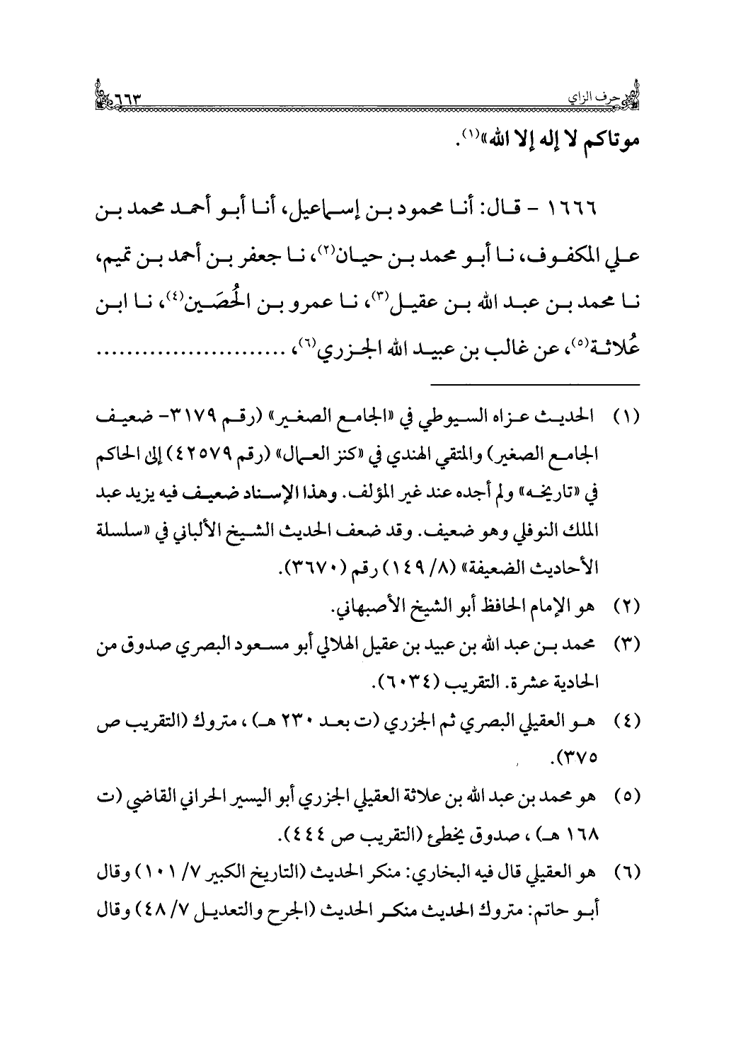 ١٦٦٦ - قال: أنا محمود بن إسماعيل، أنا أبو أحمد محمد بن علي المكفوف، نا أبو محمد بن حيان (¬٢)، نا جعفر بن أحمد بن تميم، نا محمد بن عبد الله بن عقيل (¬٣)، نا عمروبن الحُصَين (¬٤)، نا ابن عُلاثة (¬٥)، عن غالب بن عبيد الله الجزري (¬٦)، . . . . . . . . .