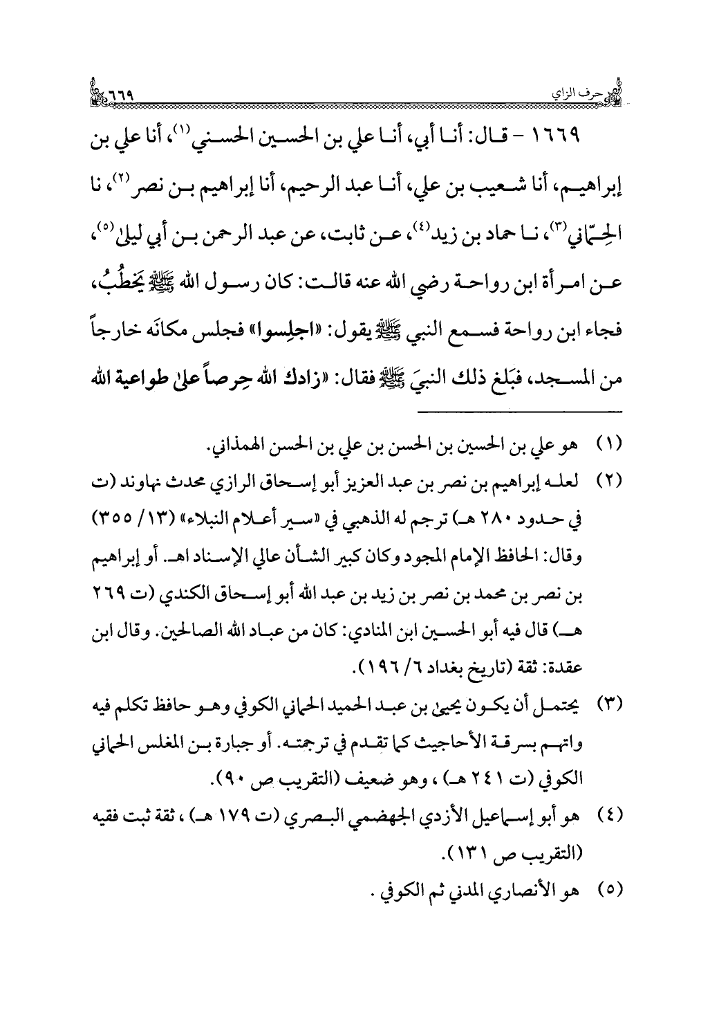١٦٦٩ - قال: أنا أبي، أنا علي بن الحسين الحسني (¬١)، أنا علي بن إبراهيم، أنا شعيب بن علي، أنا عبد الرحيم، أنا إبراهيم بن نصر (¬٢)، نا الحِمّاني (¬٣)، نا حماد بن زيد (¬٤)، عن ثابت، عن عبد الرحمن بن أبي ليلى (¬٥)، عن امرأة ابن رواحة رضي الله عنها قالت: كان رسول الله - صلى الله عليه وسلم - يَخطُبُ، فجاء ابن رواحة فسمع النبي - صلى الله عليه وسلم - يقول: "اجلِسوا" فجلس مكانَه خارجًا من المسجد، فبَلغ ذلك النبيَ - صلى الله عليه وسلم - فقال: "زادك الله حِرصًا على طواعية الله