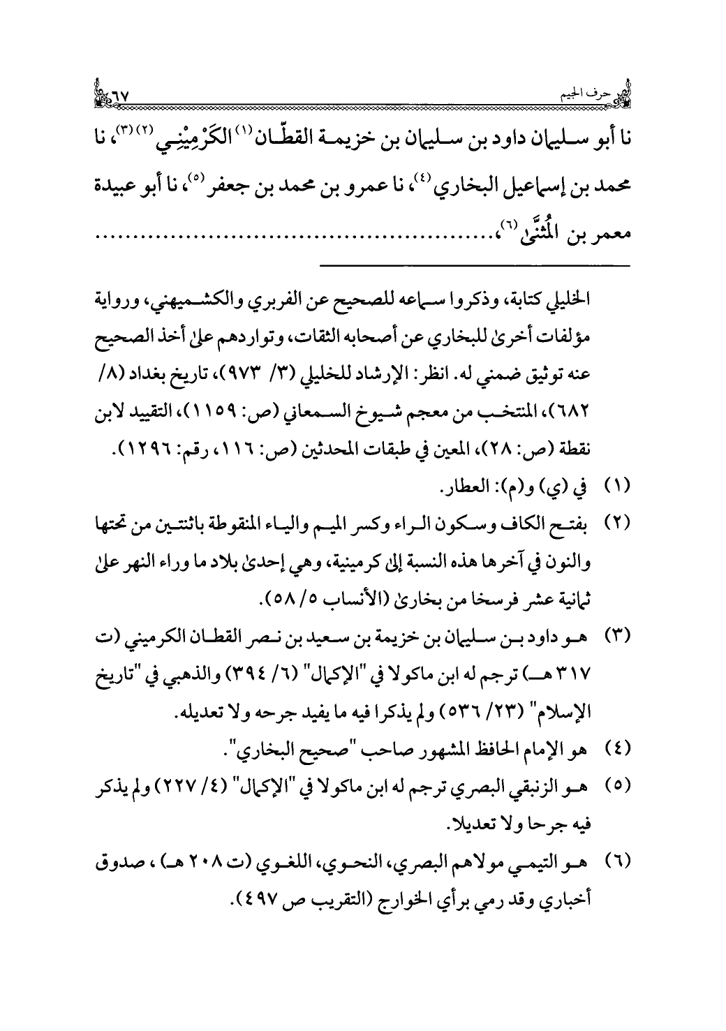 نا أبو سليمان داود بن سليمان بن خزيمة القطّان (¬١) الكَرْمِيْنِي (¬٢) (¬٣)، نا محمد بن إسماعيل البخاري (¬٤)، نا عمرو بن محمد بن جعفر (¬٥)، نا أبو عبيدة معمر بن المُثنَّى (¬٦)، . . . . . . . . . . . . . . . .