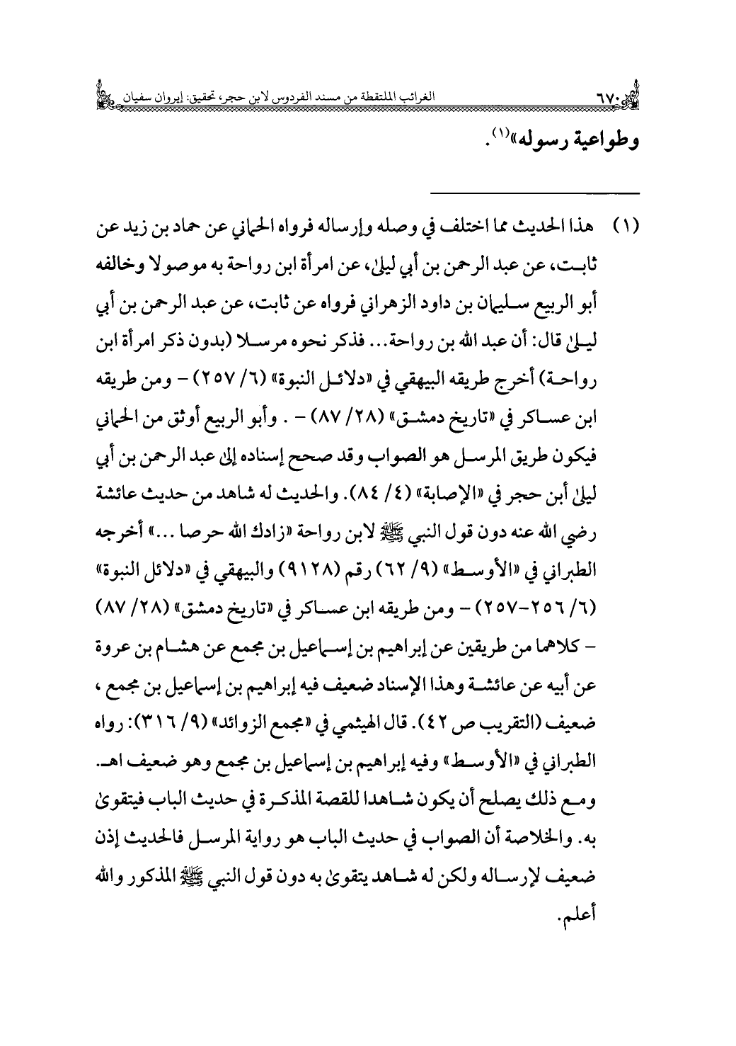 (¬١) هذا الحديث مما اختلف في وصله وإرساله فرواه الحماني عن حماد بن زيد عن ثابت، عن عبد الرحمن بن أبي ليلى، عن امرأة ابن رواحة به موصولا وخالفه أبو الربيع سليمان بن داود الزهراني فرواه عن ثابت، عن عبد الرحمن بن أبي ليلى قال: أن عبد الله بن رواحة. . . فذكر نحوه مرسلا (بدون ذكر امرأة ابن رواحة) أخرج طريقه البيهقي في "دلائل النبوة" (٦/ ٢٥٧) - ومن طريقه ابن عساكر في "تاريخ دمشق" (٢٨/ ٨٧) -. وأبو الربيع أوثق من الحماني فيكون طريق المرسل هو الصواب وقد صحح إسناده إلى عبد الرحمن بن أبي ليلى أبن حجر في "الإصابة" (٤/ ٨٤). والحديث له شاهد من حديث عائشة رضي الله عنها دون قول النبي - صلى الله عليه وسلم - لابن رواحة "زادك الله حرصا. . ." أخرجه الطبراني في "الأوسط" (٩/ ٦٢) رقم (٩١٢٨) والبيهقي في "دلائل النبوة" (٦/ ٢٥٦ - ٢٥٧) - ومن طريقه ابن عساكر في "تاريخ دمشق" (٢٨/ ٨٧) - كلاهما من طريقين عن إبراهيم بن إسماعيل بن مجمع عن هشام بن عروة عن أبيه عن عائشة وهذا الإسناد ضعيف فيه إبراهيم بن إسماعيل بن مجمع، ضعيف (التقريب ص ٤٢). قال الهيثمي في "مجمع الزوائد" (٩/ ٣١٦): رواه الطبراني في "الأوسط" وفيه إبراهيم بن إسماعيل بن مجمع وهو ضعيف اهـ. ومع ذلك يصلح أن يكون شاهدا للقصة المذكرة في حديث الباب فيتقوى به. والخلاصة أن الصواب في حديث الباب هو رواية المرسل فالحديث إذن ضعيف لإرساله ولكن له شاهد يتقوى به دون قول النبي - صلى الله عليه وسلم - المذكور والله أعلم.