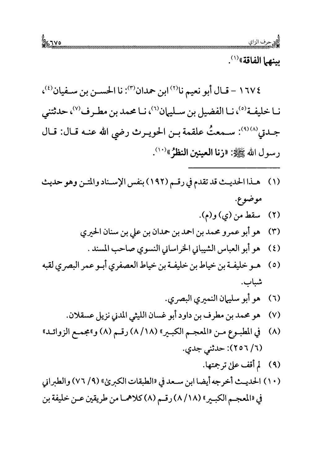 ١٦٧٤ - قال أبو نعيم نا (¬٢) ابن حمدان (¬٣): نا الحسن بن سفيان (¬٤)، نا خليفة (¬٥)، نا الفضيل بن سليمان (¬٦)، نا محمد بن مطرف (¬٧)، حدثتني جدتي (¬٨) (¬٩): سمعتُ علقمة بن الحويرث رضي الله عنه قال: قال رسول الله - صلى الله عليه وسلم -: "زنا العينين النظرُ" (¬١٠).