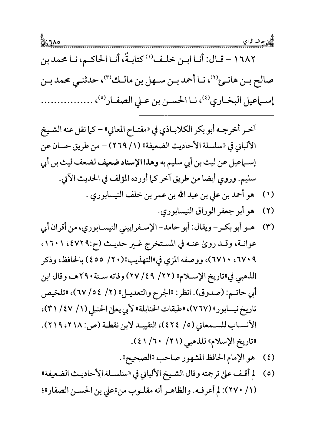 ١٦٨٢ - قال: أنا ابن خلف (¬١) كتابةً، أنا الحاكم، نا محمد بن صالح بن هانئ (¬٢)، نا أحمد بن سهل بن مالك (¬٣)، حدثني محمد بن إسماعيل البخاري (¬٤)، نا الحسن بن علي الصفار (¬٥)، . . . . . .