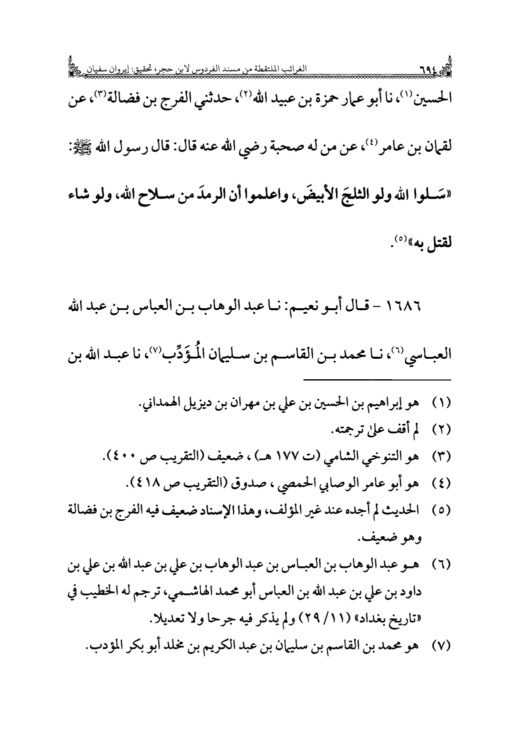 (¬٥) الحديث لم أجده عند غير المؤلف، وهذا الإسناد ضعيف فيه الفرج بن فضالة وهو ضعيف.