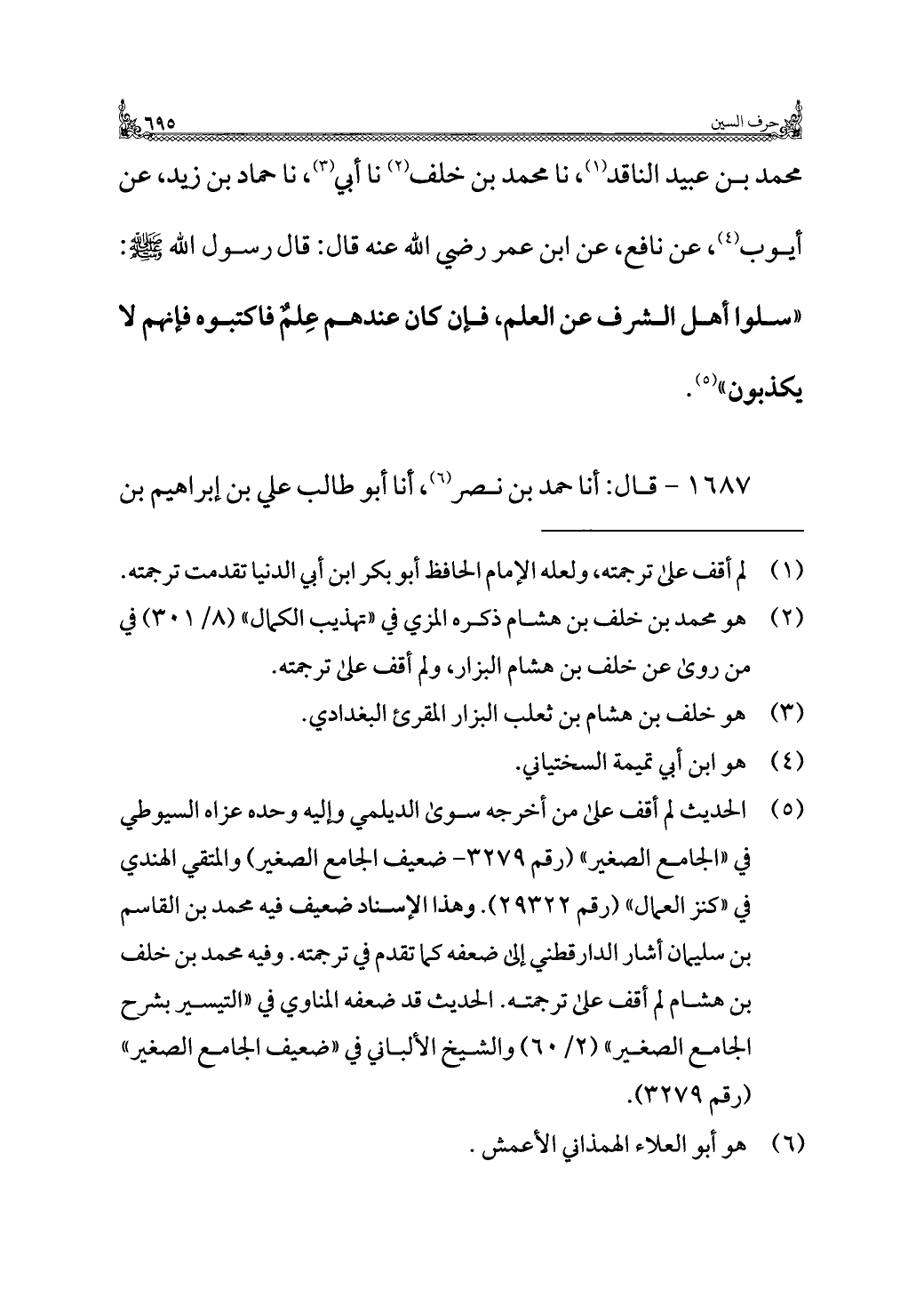 محمد بن عبيد الناقد (¬١)، نا محمد بن خلف (¬٢) نا أبي (¬٣)، نا حماد بن زيد، عن أيوب (¬٤)، عن نافع، عن ابن عمر رضي اللَّه عنه قال: قال رسول اللَّه -صلى اللَّه عليه وسلم-: "سلوا أهل الشرف عن العلم، فإن كان عندهم عِلمٌ فاكتبوه فإنهم لا يكذبون" (¬٥).