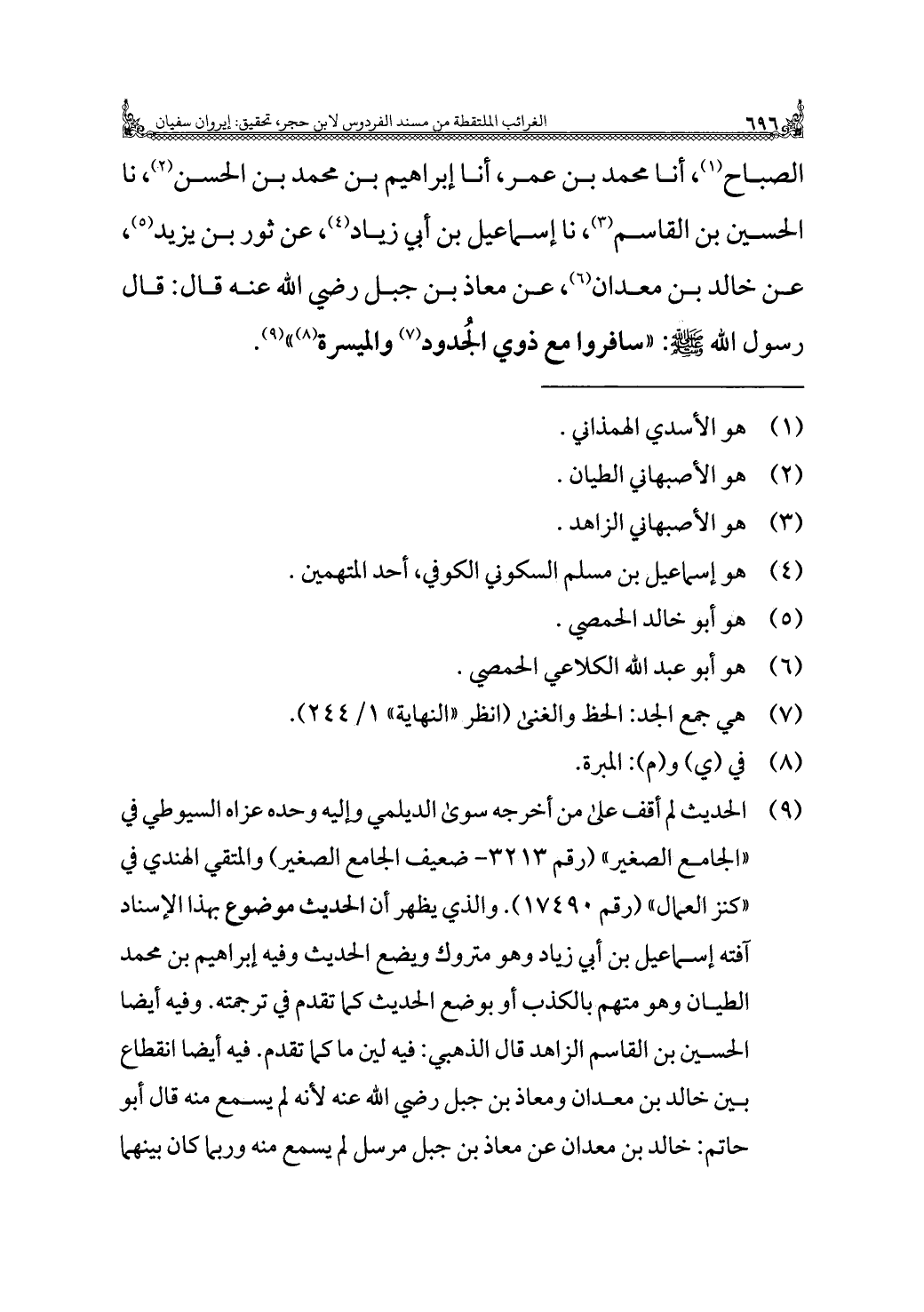 الصباح (¬١)، أنا محمد بن عمر، أنا إبراهيم بن محمد بن الحسن (¬٢)، نا الحسين بن القاسم (¬٣)، نا إسماعيل بن أبي زياد (¬٤)، عن ثور بن يزيد (¬٥)، عن خالد بن معدان (¬٦)، عن معاذ بن جبل رضي اللَّه عنه قال: قال رسول اللَّه -صلى اللَّه عليه وسلم-: "سافروا مع ذوي الجُدود (¬٧) والميسرة (¬٨) " (¬٩).
