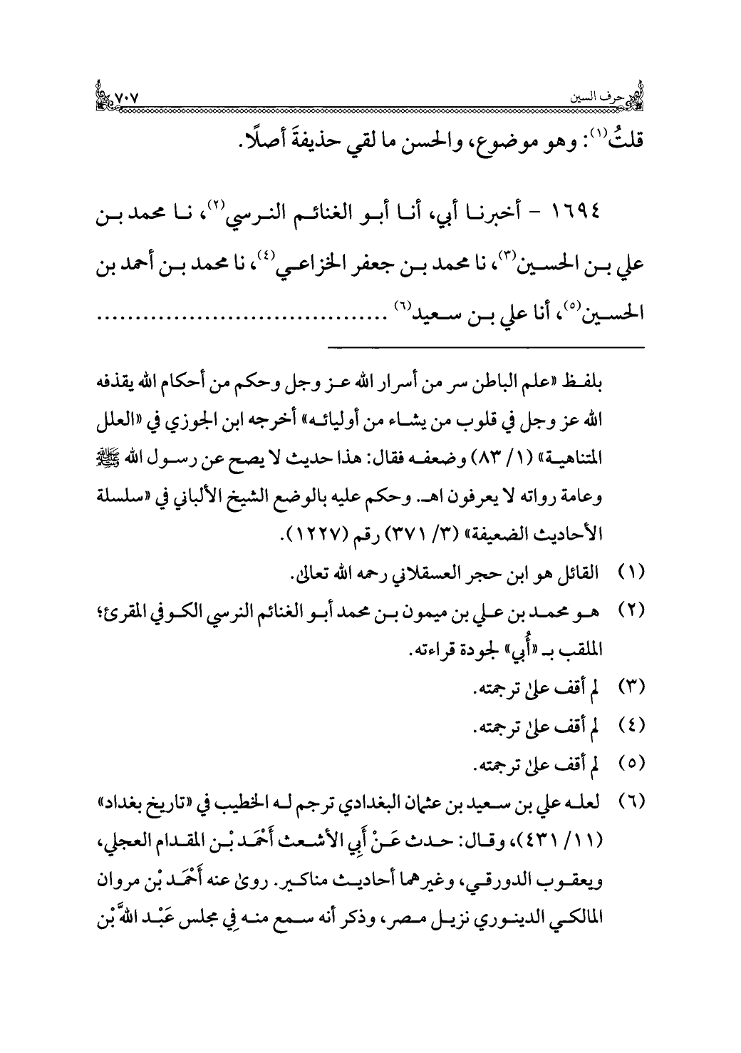 ١٦٩٤ - أخبرنا أبي، أنا أبو الغنائم النرسي (¬٢)، نا محمد بن علي بن الحسين (¬٣)، نا محمد بن جعفر الخزاعي (¬٤)، نا محمد بن أحمد بن الحسين (¬٥)، أنا علي بن سعيد (¬٦). . . . . .