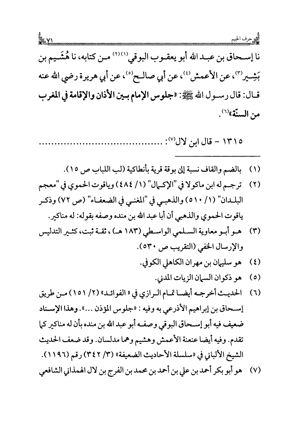 نا إسحاق بن عبد الله أبو يعقوب البوقي (¬١) (¬٢) من كتابه، نا هُشَيم بن بَشِير (¬٣)، عن الأعمش (¬٤)، عن أبي صالح (¬٥)، عن أبي هريرة رضي الله عنه قال: قال رسول الله - صلى الله عليه وسلم -: "جلوس الإمام بين الأذان والإقامة في المغرب من السنّة" (¬٦).