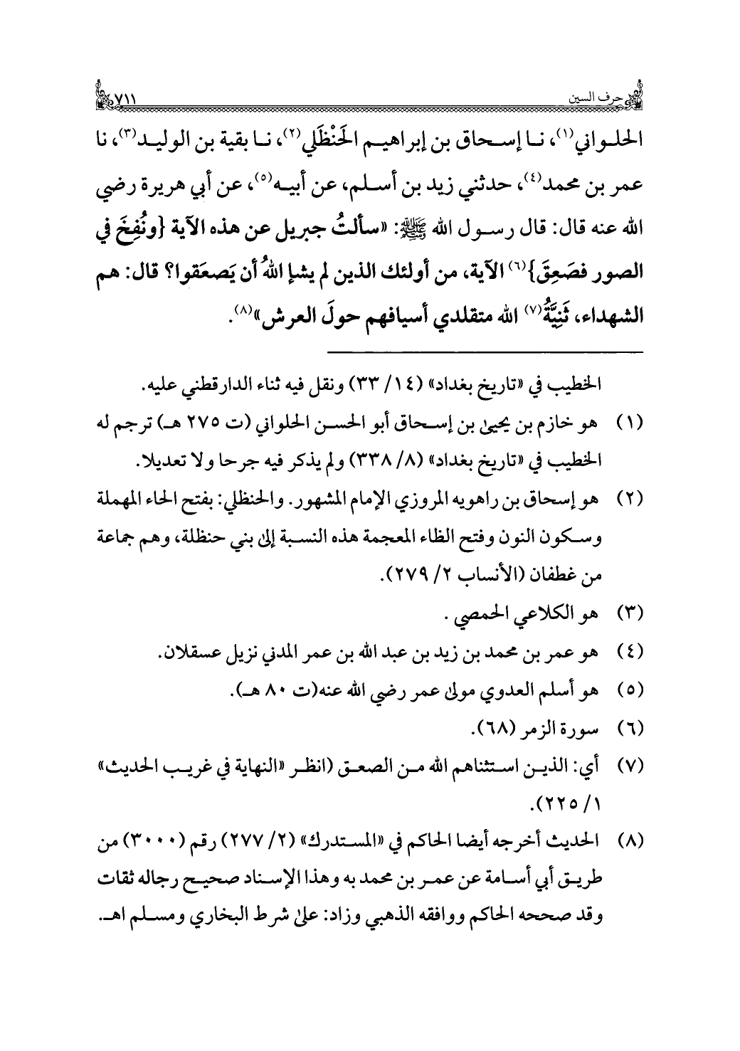 الحلواني (¬١)، نا إسحاق بن إبراهيم الحَنْظَلي (¬٢)، نا بقية بن الوليد (¬٣)، نا عمر بن محمد (¬٤)، حدثني زيد بن أسلم، عن أبيه (¬٥)، عن أبي هريرة رضي اللَّه عنه قال: قال رسول اللَّه -صلى اللَّه عليه وسلم-: "سألتُ جبريل عن هذه الآية {وَنُفِخَ فِي الصُّورِ فَصَعِقَ} (¬٦) الآية، من أولئك الذين لم يشإ اللَّهُ أن يَصعَقوا؟ قال: هم الشهداء، ثَنِيَّةُ (¬٧) اللَّه متقلدي أسيافهم حولَ العرش" (¬٨).