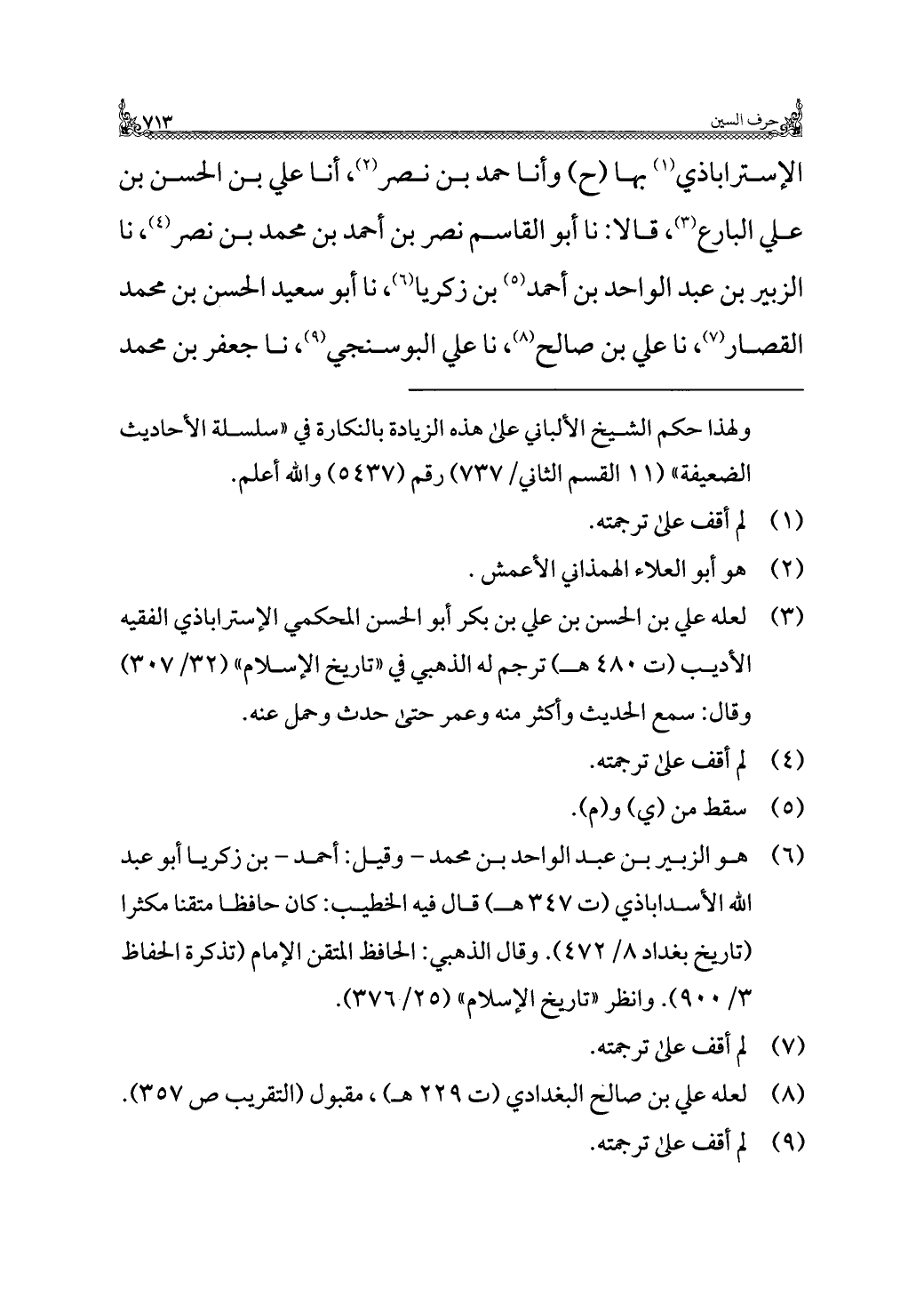 الإستراباذي (¬١) بها (ح) وأنا حمد بن نصر (¬٢)، أنا علي بن الحسن بن علي البارع (¬٣)، قالا: نا أبو القاسم نصر بن أحمد بن محمد بن نصر (¬٤)، نا الزبير بن عبد الواحد بن أحمد (¬٥) بن زكريا (¬٦)، نا أبو سعيد الحسن بن محمد القصار (¬٧)، نا علي بن صالح (¬٨)، نا علي البوسنجي (¬٩)، نا جعفر بن محمد