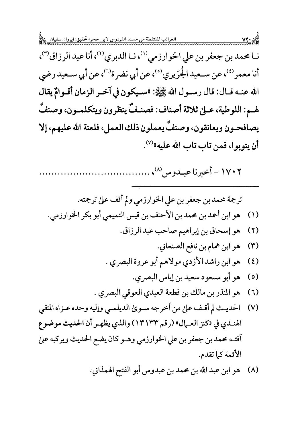 (¬٧) الحديث لم أقف على من أخرجه سوى الديلمي وإليه وحده عزاه المتقي الهندي في "كنز العمال" (رقم ١٣١٣٣) والذي يظهر أن الحديث موضوع آفته محمد بن جعفر بن علي الخوارزمي وهو كان يضع الحديث ويركبه على الأئمة كما تقدم.