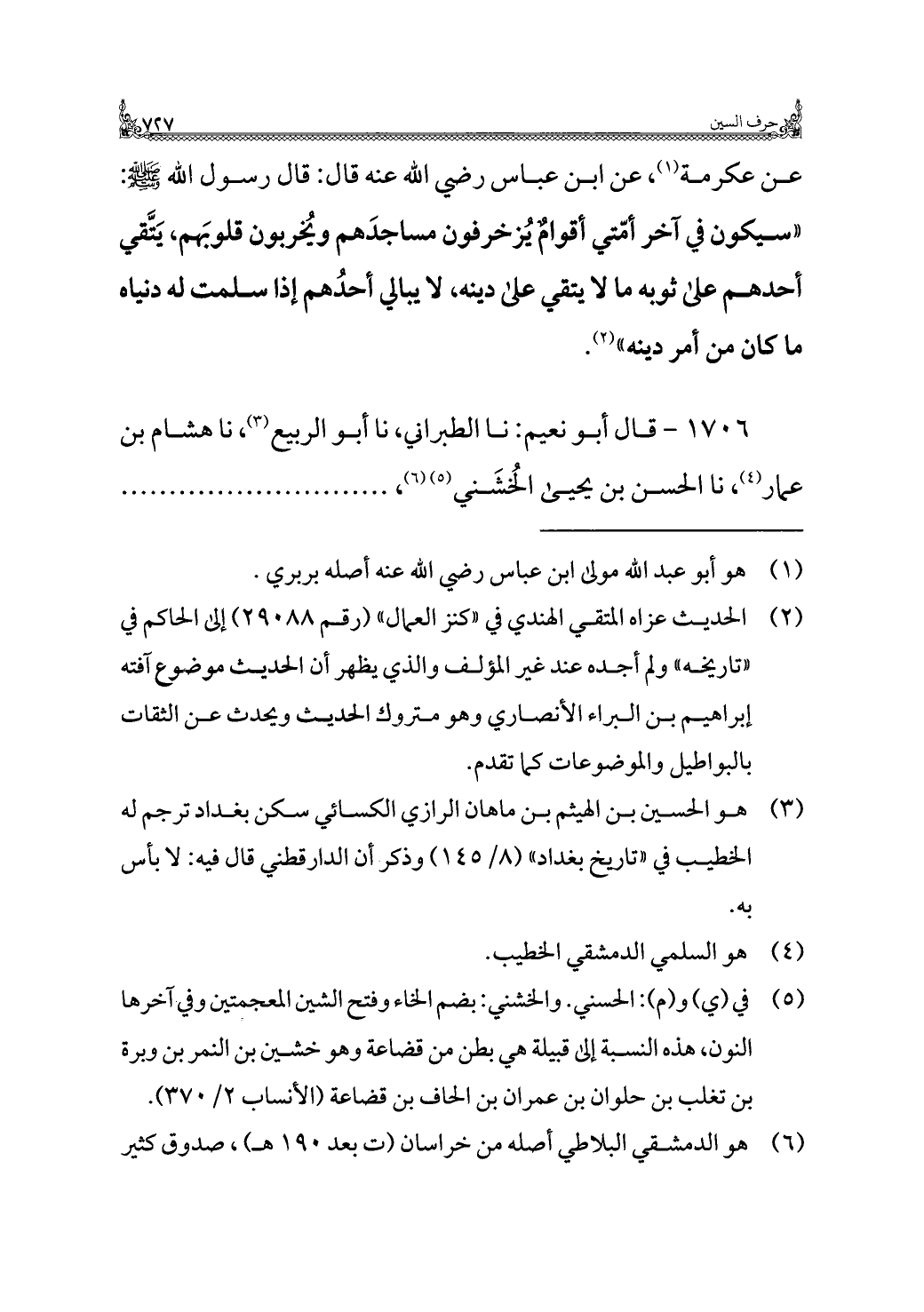 ١٧٠٦ - قال أبو نعيم: نا الطبراني، نا أبو الربيع (¬٣)، نا هشام بن عمار (¬٤)، نا الحسن بن يحيى الخُشَني (¬٥) (¬٦)، . . . . . . .
