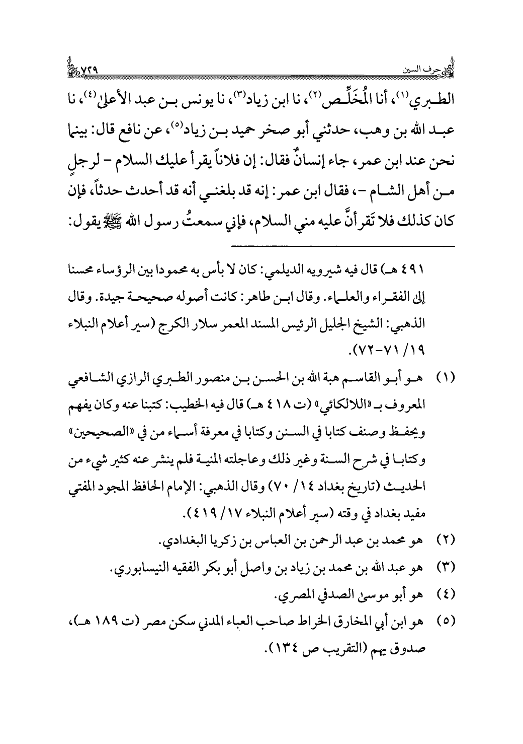 (¬١) هو أبو القاسم هبة اللَّه بن الحسن بن منصور الطبري الرازي الشافعي المعروف بـ "اللالكائي" (ت ٤١٨ هـ) قال فيه الخطيب: كتبنا عنه وكان يفهم ويحفظ وصنف كتابا في السنن وكتابا في معرفة أسماء من في "الصحيحين" وكتابا في شرح السنة وغير ذلك وعاجلته المنية فلم ينشر عنه كثير شيء من الحديث (تاريخ بغداد ١٤/ ٧٠) وقال الذهبي: الإمام الحافظ المجود المفتي مفيد بغداد في وقته (سير أعلام النبلاء ١٧/ ٤١٩).