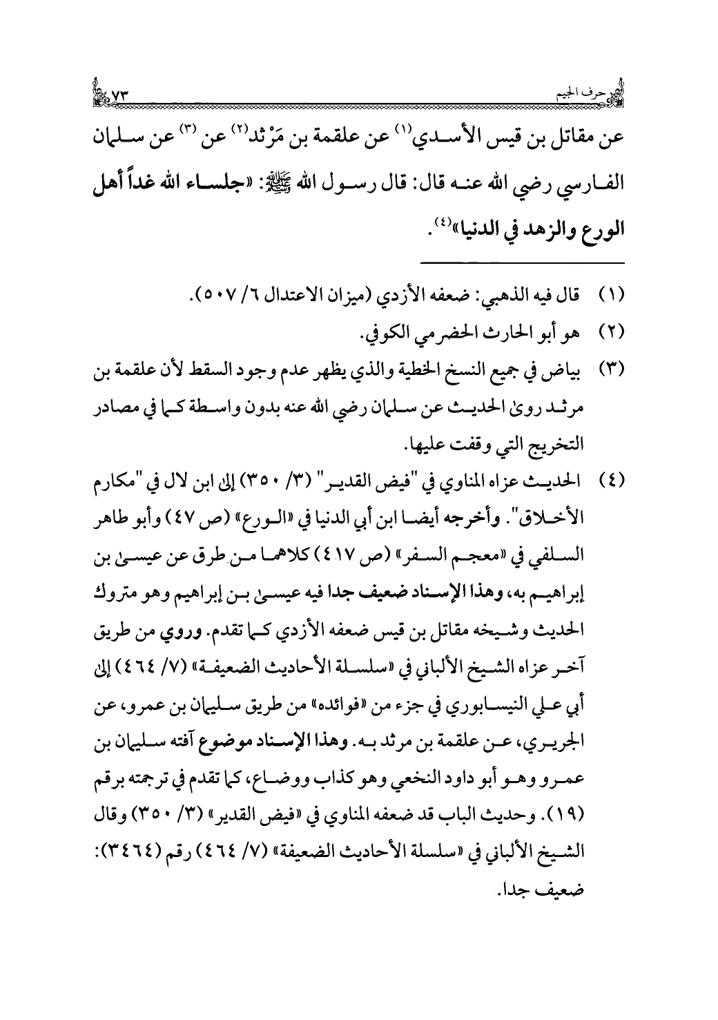 عن مقاتل بن قيس الأسدي (¬١) عن علقمة بن مَرْثد (¬٢) عن (¬٣) عن سلمان الفارسي رضي الله عنه قال: قال رسول الله - صلى الله عليه وسلم -: "جلساء الله غدًا أهل الورع والزهد في الدنيا" (¬٤).